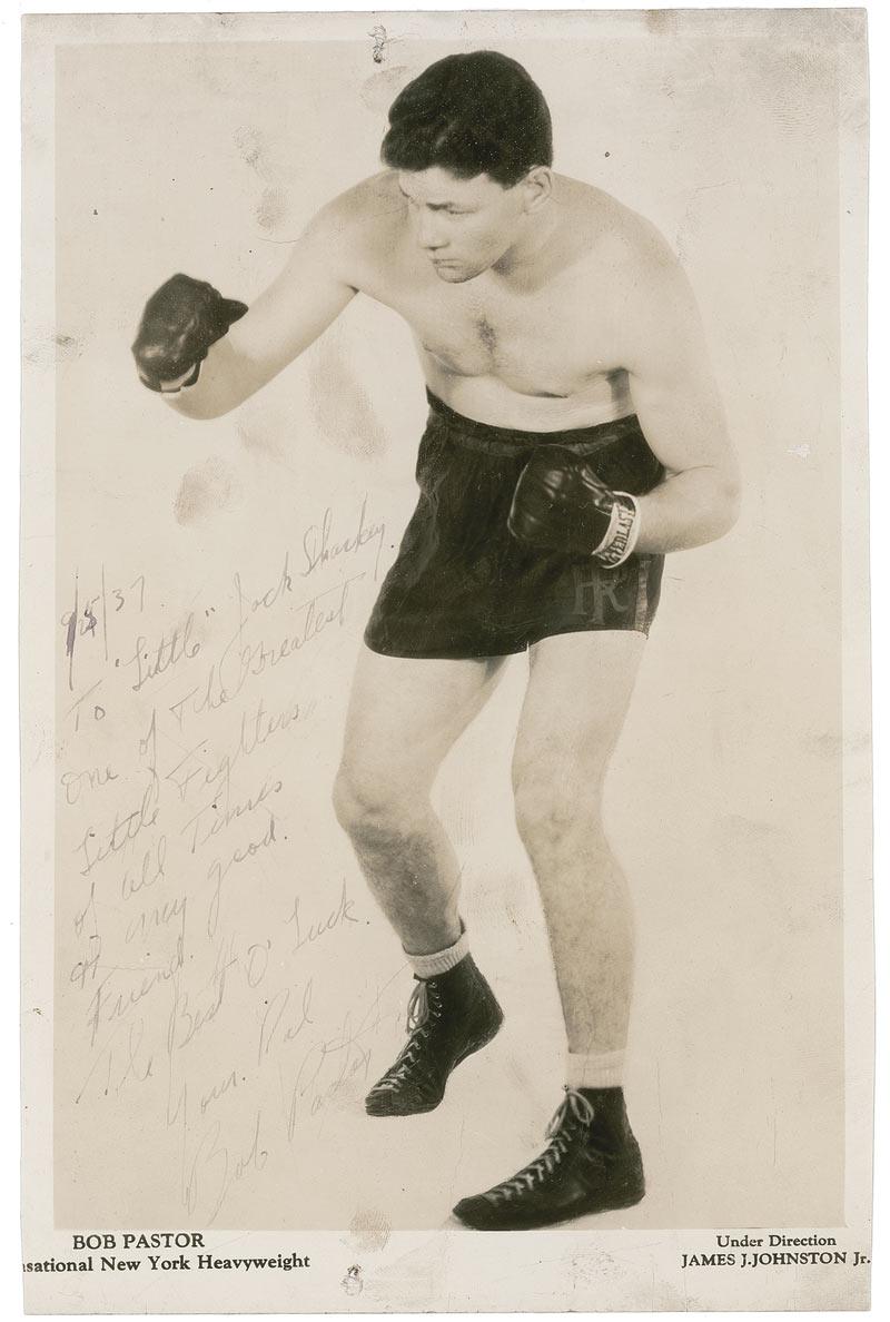 Heavyweight boxer (1914–1996). Vintage glossy 6.5 x 10 photo in a boxing pose, signed and inscribed in black ink “To ‘Little’ Jack Sharkey, one of the Greatest ‘Little’ Fighters of all times & my good friend. The Best O’ Luck, Your Pal, Bob Pastor.” In very good condition, with scattered creasing, staining, two small holes at the top and bottom borders, trimmed left and right edges, and the writing a shade light.