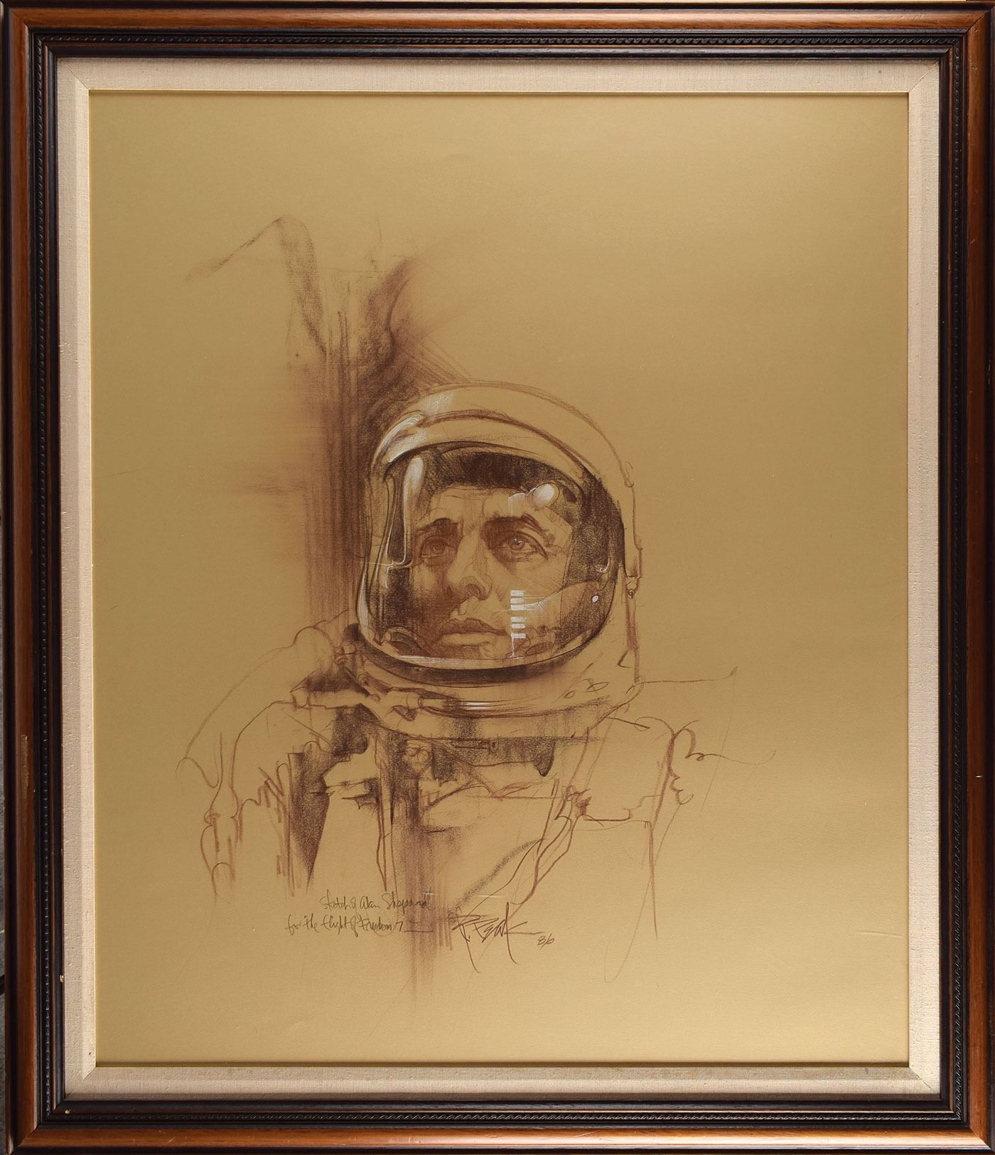 Exquisite original sketch of Alan Shepard in his Project Mercury suit before becoming the first American in space, accomplished in charcoal and chalk on a beige sheet of 29.25 x 35.25 artist's paper by acclaimed American illustrator Bob Peak. Titled, signed, and dated at the bottom in brown charcoal, "Sketch of Alan Shepard for the flight of Freedom 7—R. Peak, 86." Cloth-matted and framed to an overall size of 36 x 42. In fine condition.