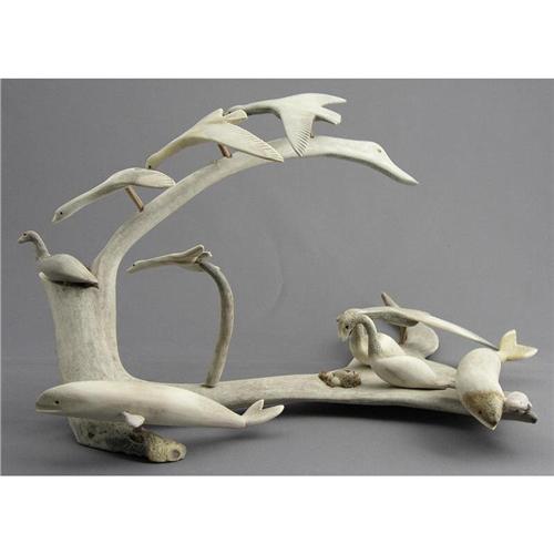 Canadian, Tuktoyaktuk [b. 1927] GEESE AND WHALES carved antler and bone with stone and dried grass accents 8.5 x 16 x 13.5 in. (21.6 x 40.6 x 34.3 cm) signed