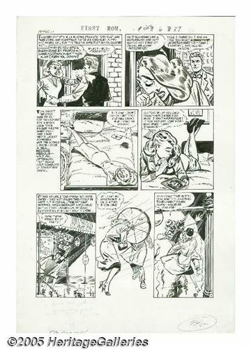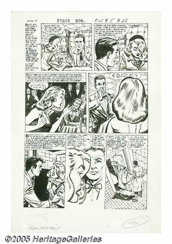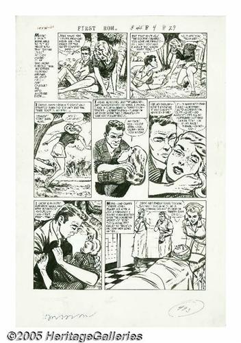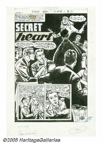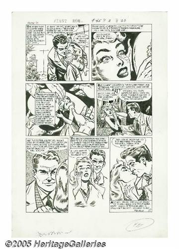 <B>Bob Powell - First Romance Magazine #45 Complete 5-page Story "Secret Heart" Original Art (Harvey, 1957).</B></I> Francie's Veronica Lake-styled locks hid a terrible facial scar, but when the torch singer met a young doctor who fell in love with her, she was soon healed. Bob Powell's "good girl" art is superb, as always. The image area of each page measures 12" x 18", and aside from Comics Code-mandated lettering corrections, the art is in Excellent condition.