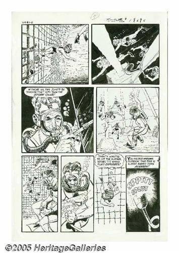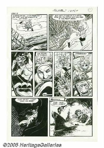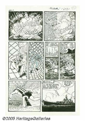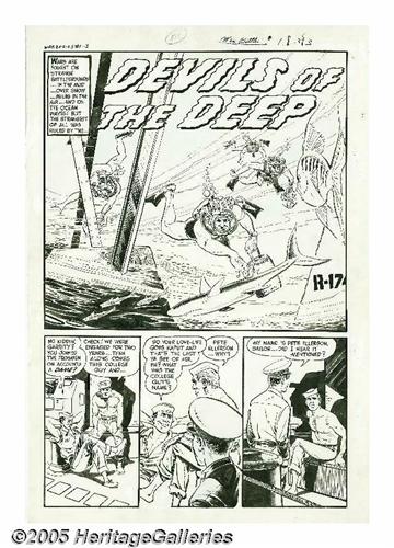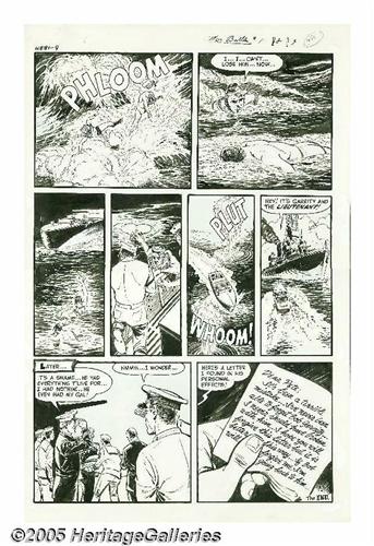<B>Bob Powell - War Battles #1, Complete 7-page Story "Devils of the Deep" Original Art (Harvey, 1952).</B></I> It's been said, "all's fair in love and war", but when a frogman is sent out on a deadly D-Day mission with the guy who stole his gal away, he makes the decision to ignore his thoughts of revenge and swim to the aid of his rival. Bob Powell's detailed art on this underwater thriller is at its most refined -- it's superb. The image area of each page measures 12" x 18", and the art is in Excellent condition.