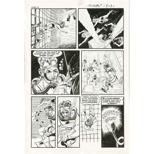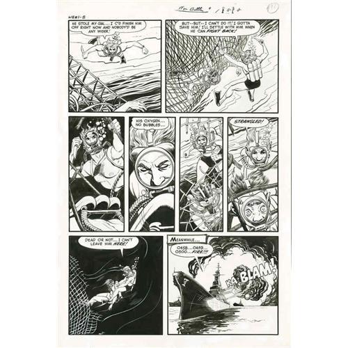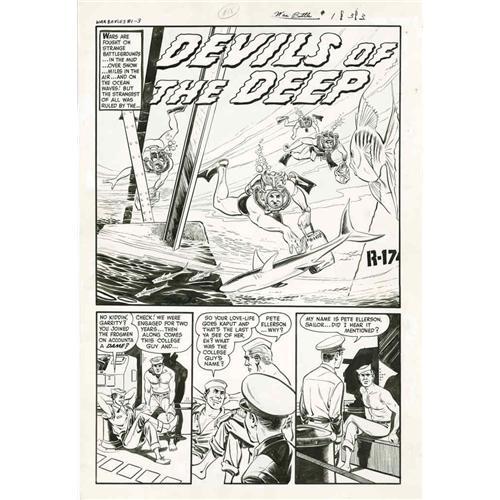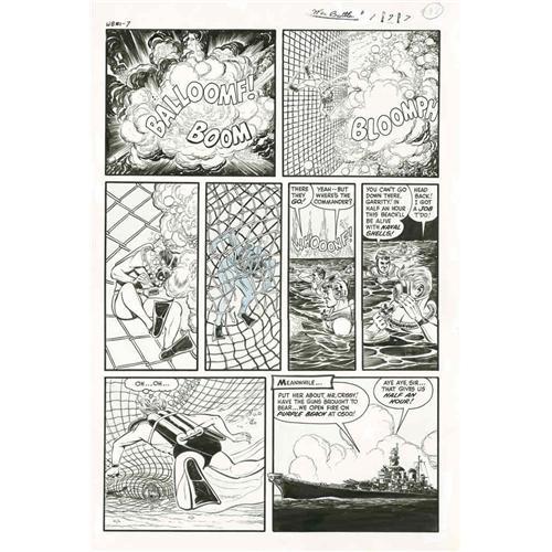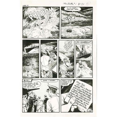 <B>Bob Powell - War Battles #1, Complete 7-page Story "Devils of the Deep" Original Art (Harvey, 1952).</B></I> It's been said, "all's fair in love and war", but when a frogman is sent out on a deadly D-Day mission with the guy who stole his gal away, he makes the decision to ignore his thoughts of revenge, and swim to the aid of his rival. Bob Powell's detailed art on this underwater thriller is at its most refined -- it's top-notch. The image area of each page measures 12" x 18", and the art is in Excellent condition.