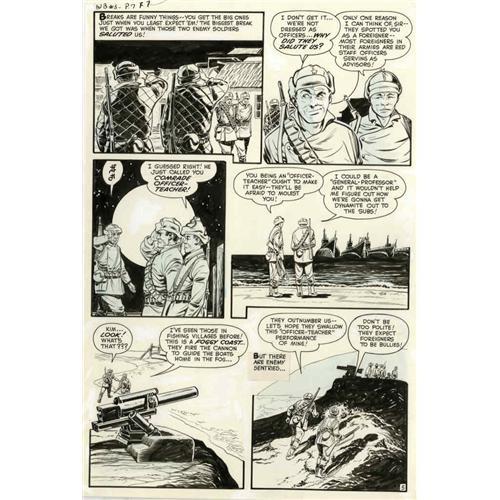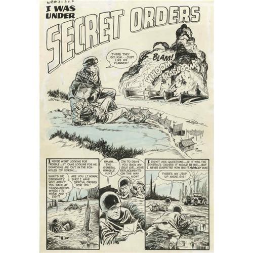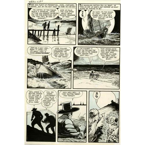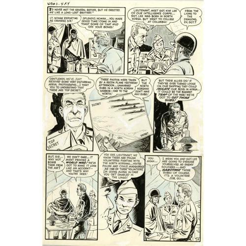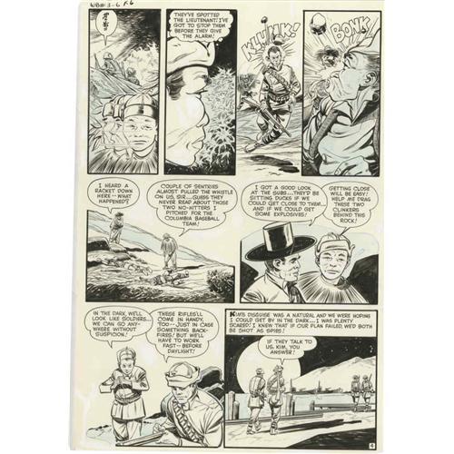 <B>Bob Powell - War Battles #3 Complete 8-page Story "I Was Under Secret Orders" Original Art (Harvey, 1952).</B></I> Lt. Nowak goes on a deadly, covert mission to spy on suspected submarine activity in Korea. Posing as an enemy combatant, a Polish volunteer, Nowak plans to infiltrate the enemy instillation accompanied by Sgt. Kim Lee, a North Korean who went to college in America. Bob Powell's art is at it's most detailed, and the inking on this thriller is superb. As is typical with Bob Powell art during this period of his career, blue ink washes were used throughout to aid the production department in creating coloring effects. The image area of each page measures 12" x 18", and the art is in Excellent condition.