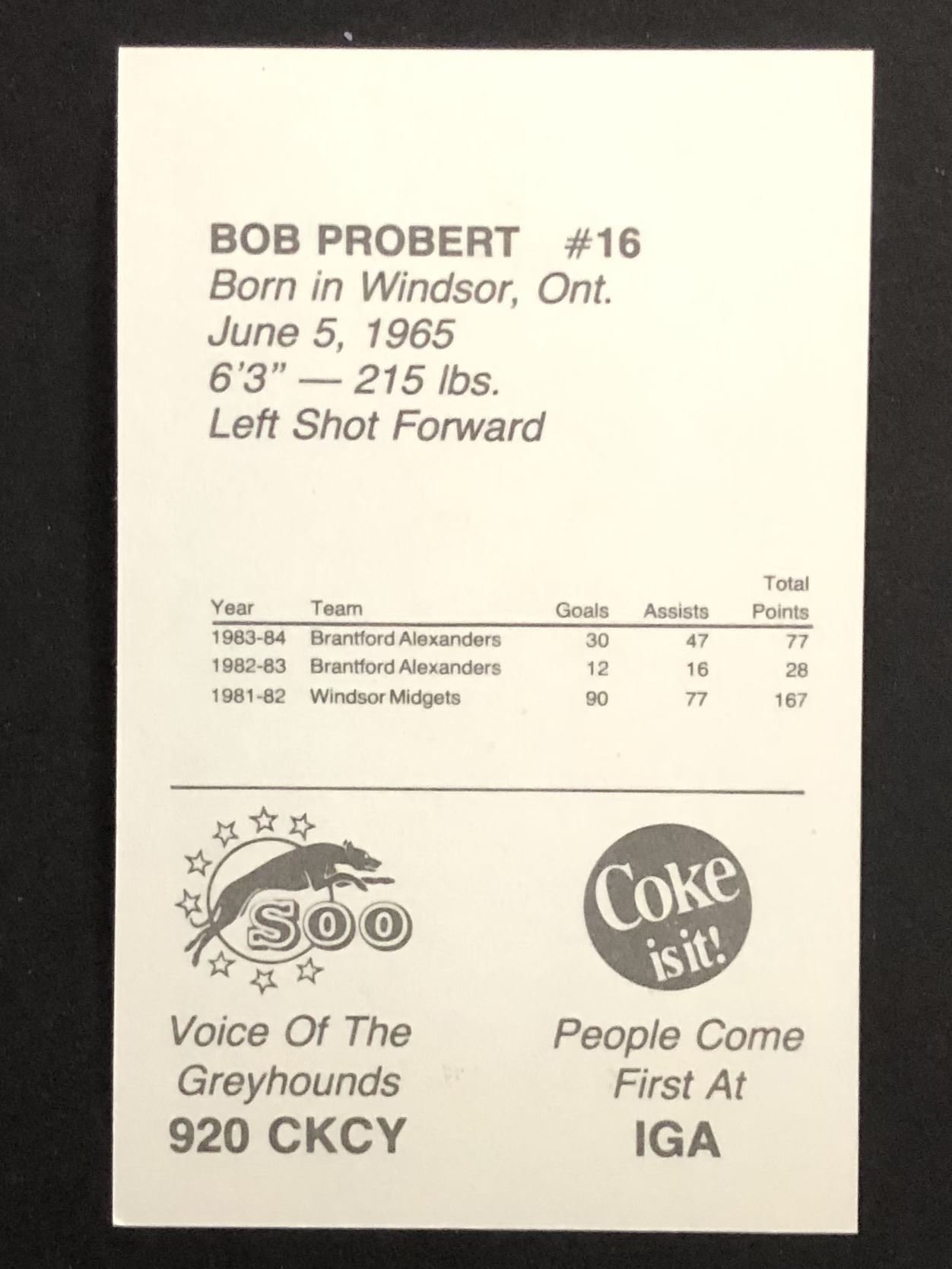 Soo Greyhounds 1984-85 card issued by Soo Regional Police