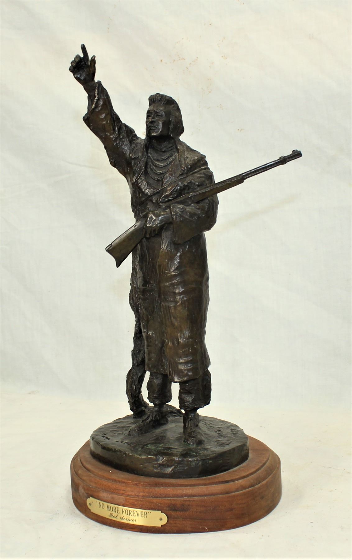 Appealing bronze with Native American subject, titled "No More Forever". Standing 15" tall. Numbered 7/75, and dated 1989.