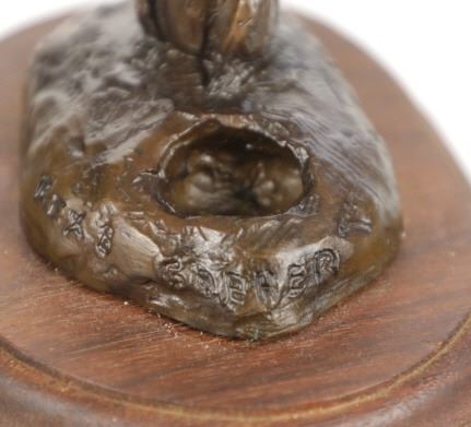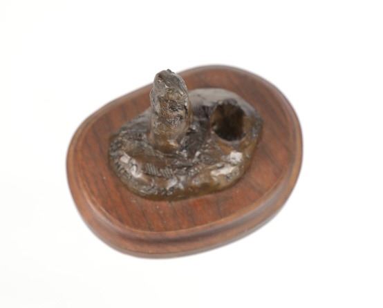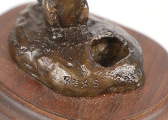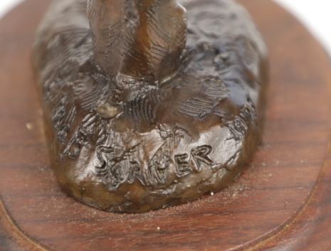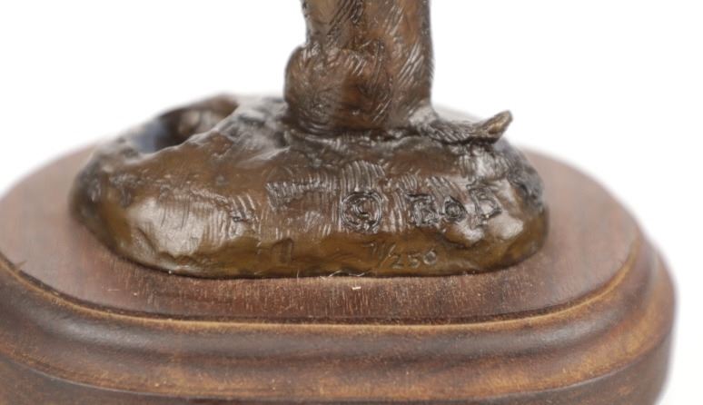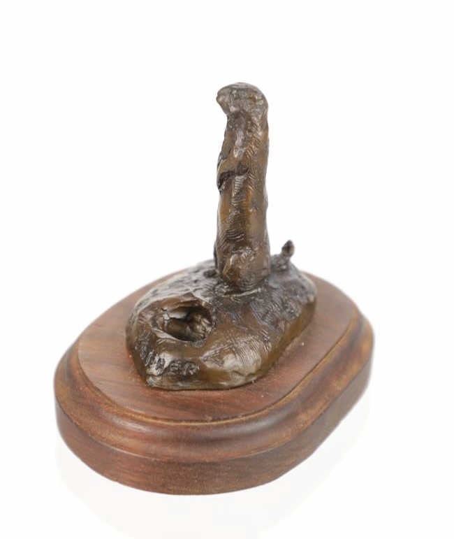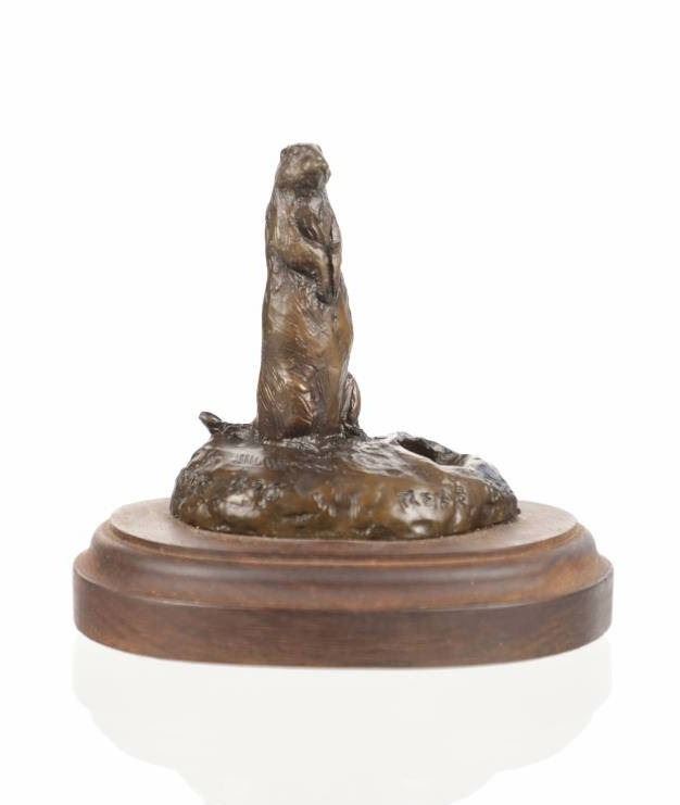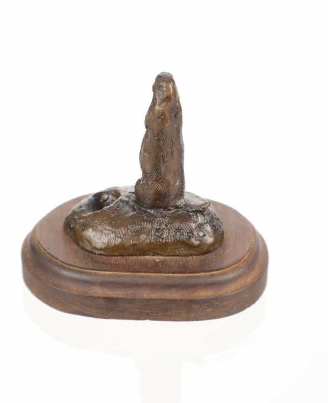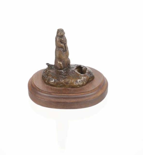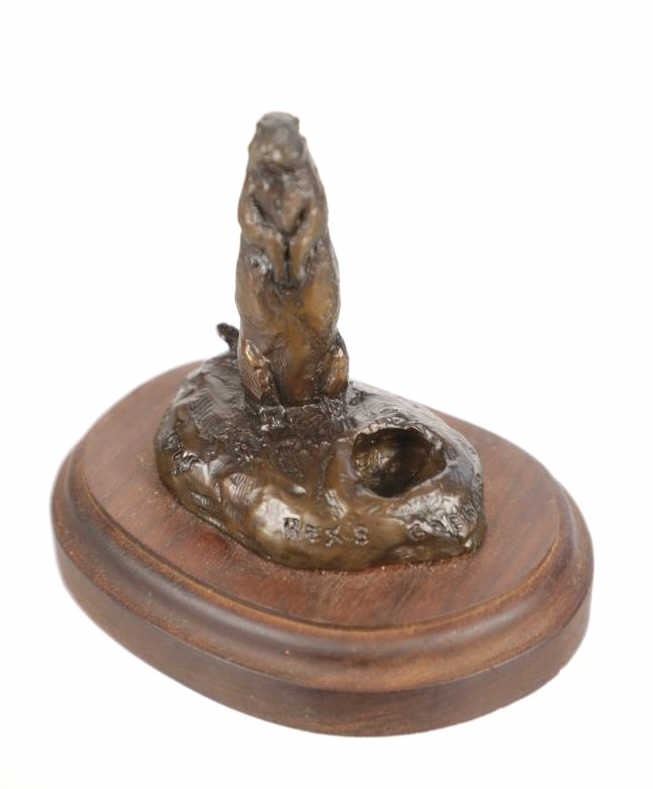 This is an original Bob Scriver bronze sculpture titled "Rex's Gopher". The piece shows the gopher standing next to his hole. Robert Macfie Scriver (1914-1999) was born in Browning, Montana (in the heart of the Blackfoot Indian Reservation) in 1914. Scriver began sculpting using taxidermy to learn his craft of making wildlife bronzes. By 1962 he became a charter member of the Society of Animal Artists, had been accepted into the prestigious Cowboy Artists of America, listed in Who’s Who in American Art, and a member of the National Sculpture Society, and the National Academy of Western Art. This is a Lost Wax Bronze Casting and shows a walnut base. Bob Scriver bronzes have been valued at over $30,000-$50,000. He is believed to be "The Cowboy’s National Sculptor" and one of the finest Montana bronze artists of the 20th century. This bronze is in good condition. It measures 3.75" x 4.75" and is 4" tall. The piece is numbered 71/250. The collective weight is 14oz.