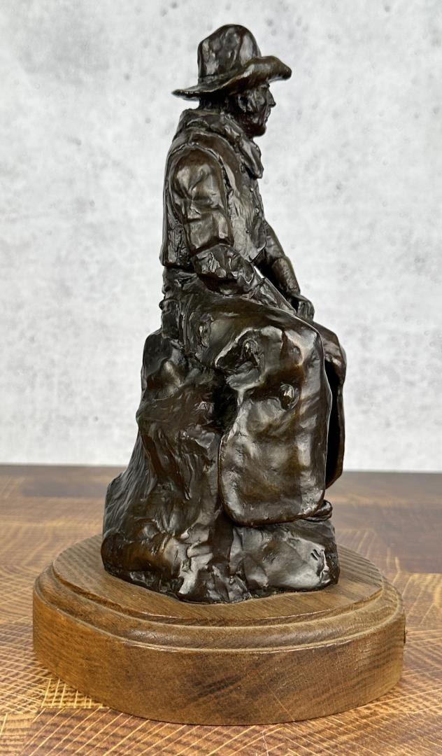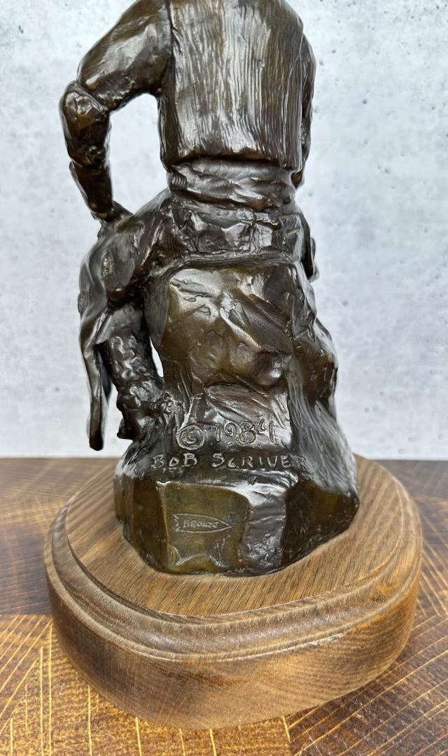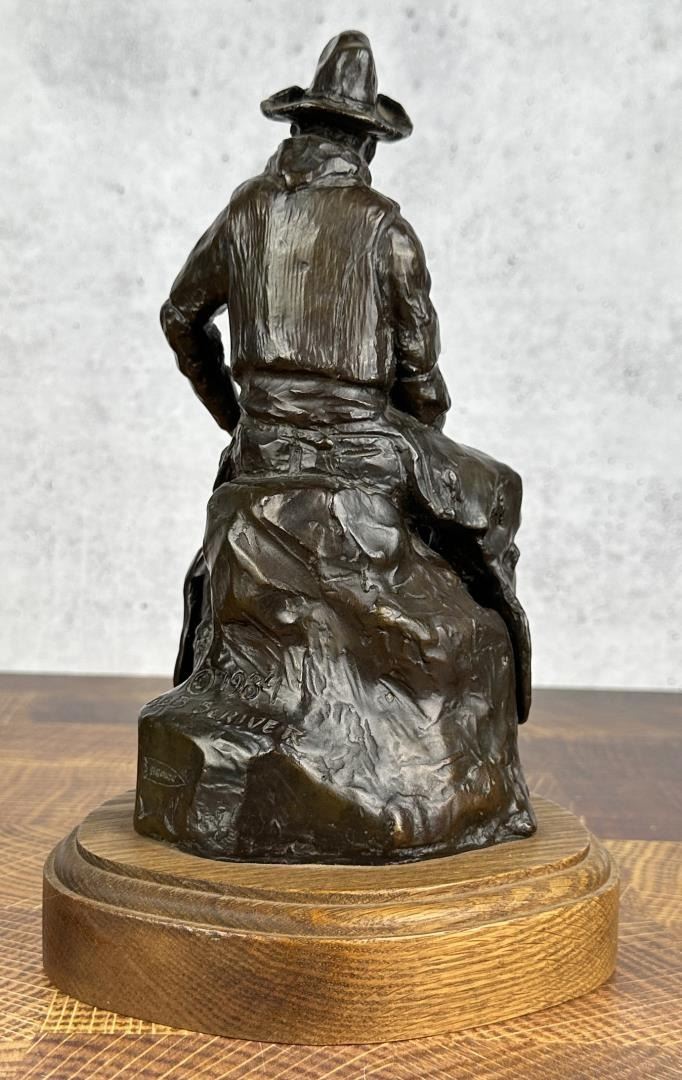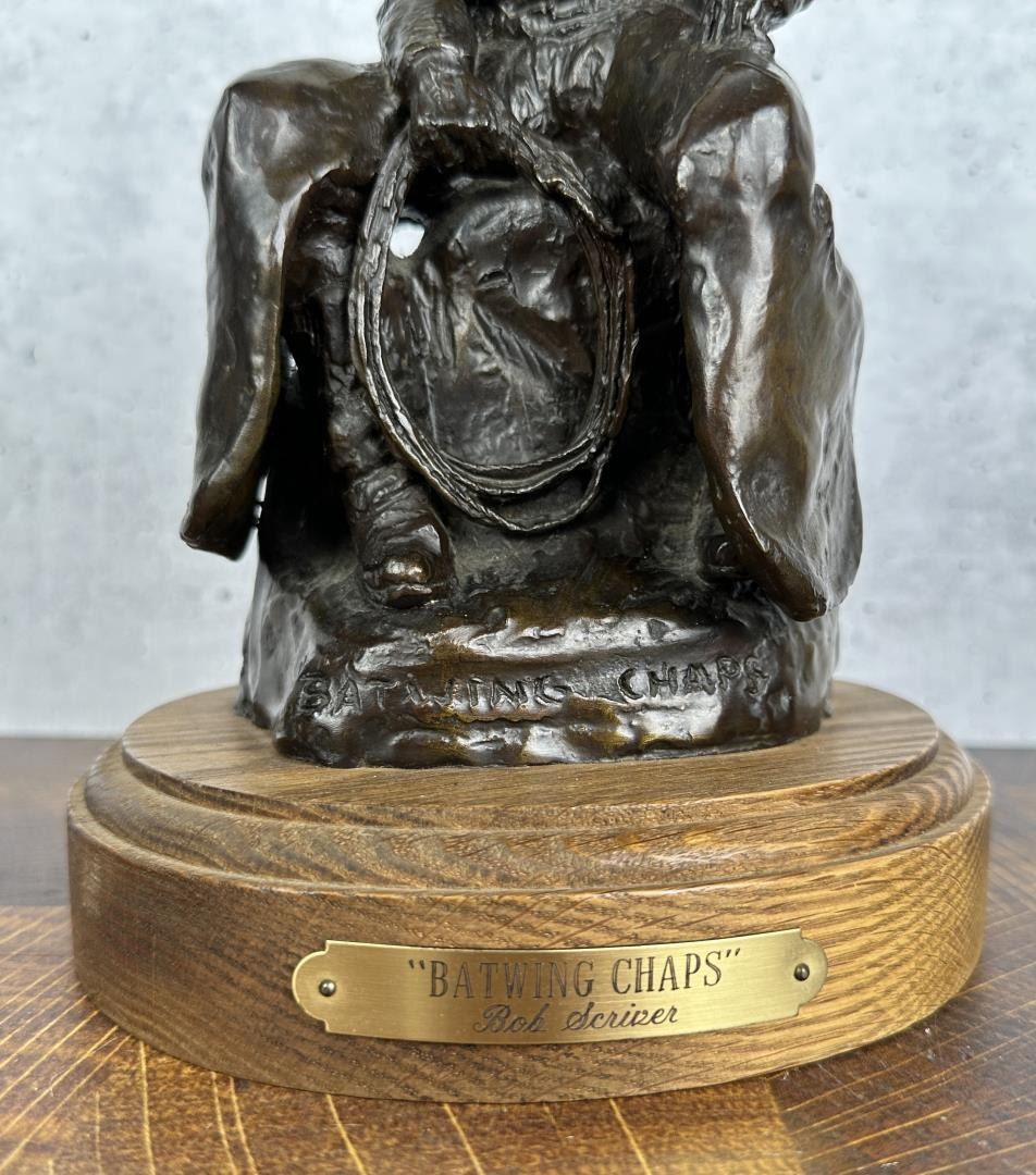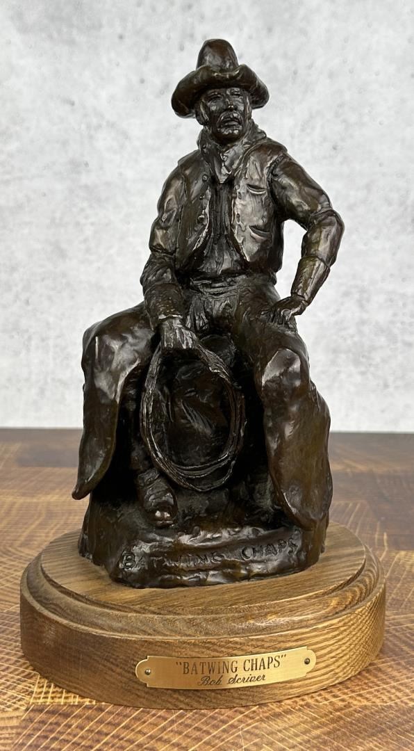 Title is Batwing Chaps. 10 5/8" by 7" by 6 1/4". Bob (Robert Macfie) Scriver (1914 - 1999) was active/lived in Montana. Bob Scriver is known for Animal and western sculpture. Bob Scriver was an elected member in both the Cowboy Artists of America organization and the National Academy of Western Art. He was a member of the Salmagundi Club and was accepted for membership in the National Sculpture Society. Scriver created heroic sculptures in Montana of the expedition of Lewis and Clark, and in Wyoming of the legendary Buffalo Bill. His Cowboy works include a heroic work of Bill Linderman at the Cowboy Hall of Fame in Oklahoma and his "Rodeo In Bronze" series, one of four belonging to the Devonian Institute in Canada. Scriver was commissioned to do such pieces as a Montana Trapper and belt buckle for the Montana Historical Society to help raise funds to purchase the C.M. Russell painting, When the Land Belonged to God, which raised $96,000.00. In 1981, for the Winchester Arms Company, he was also commissioned to do a famous logo called, The Winchester Rider. This set a new record for contemporary sculptors with gross sales totaling over one million dollars. This edition of 250 was completely sold out in 30 days from the time of National advertising. Scriver's art depicts a sense of freedom that has been lost by the Indian and is seemingly being lost by the cowboy. The Late Dr. Harold McCracken, Director Emeritus of the Whitney Gallery of Western Art, was quoted in the forward of Scriver's book NO MORE BUFFALO as calling Scriver: "America's foremost sculptor today-bar none". Scriver died January 29,1999. He has left behind him stories, and dreams of the West....in bronze.