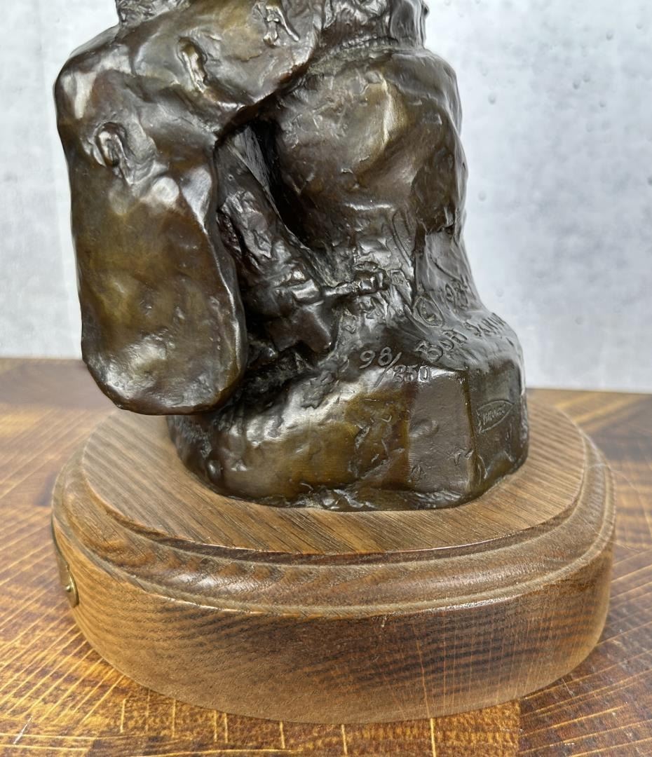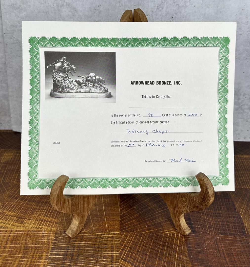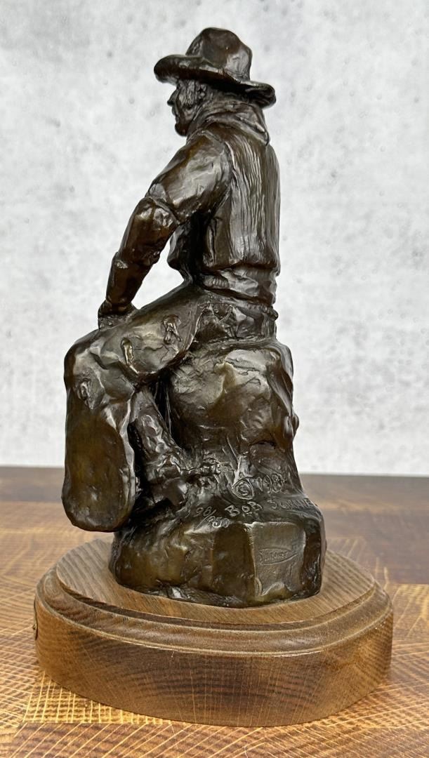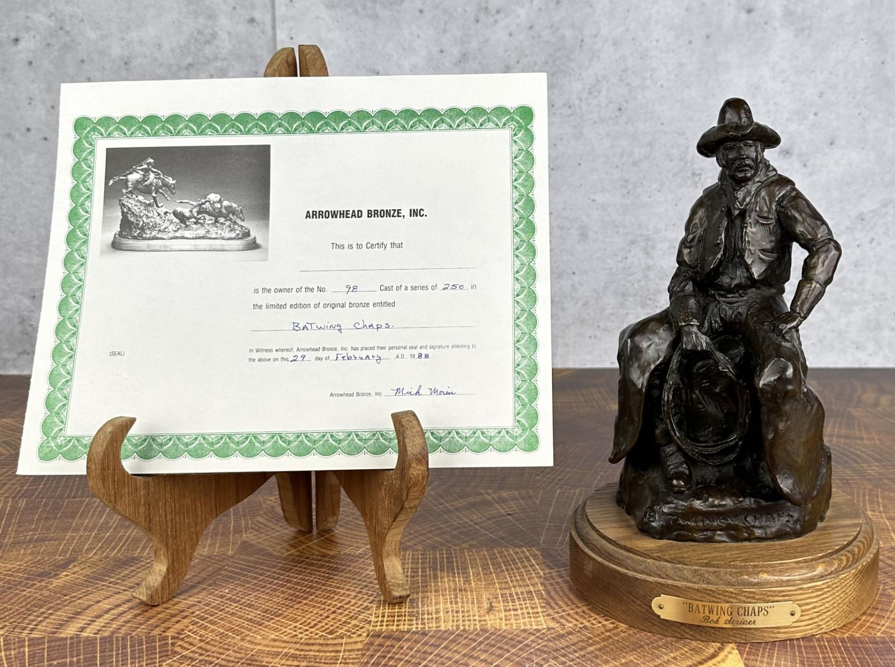 Title is Batwing Chaps. 10 5/8" by 7" by 6 1/4". Bob (Robert Macfie) Scriver (1914 - 1999) was active/lived in Montana. Bob Scriver is known for Animal and western sculpture. Bob Scriver was an elected member in both the Cowboy Artists of America organization and the National Academy of Western Art. He was a member of the Salmagundi Club and was accepted for membership in the National Sculpture Society. Scriver created heroic sculptures in Montana of the expedition of Lewis and Clark, and in Wyoming of the legendary Buffalo Bill. His Cowboy works include a heroic work of Bill Linderman at the Cowboy Hall of Fame in Oklahoma and his "Rodeo In Bronze" series, one of four belonging to the Devonian Institute in Canada. Scriver was commissioned to do such pieces as a Montana Trapper and belt buckle for the Montana Historical Society to help raise funds to purchase the C.M. Russell painting, When the Land Belonged to God, which raised $96,000.00. In 1981, for the Winchester Arms Company, he was also commissioned to do a famous logo called, The Winchester Rider. This set a new record for contemporary sculptors with gross sales totaling over one million dollars. This edition of 250 was completely sold out in 30 days from the time of National advertising. Scriver's art depicts a sense of freedom that has been lost by the Indian and is seemingly being lost by the cowboy. The Late Dr. Harold McCracken, Director Emeritus of the Whitney Gallery of Western Art, was quoted in the forward of Scriver's book NO MORE BUFFALO as calling Scriver: "America's foremost sculptor today-bar none". Scriver died January 29,1999. He has left behind him stories, and dreams of the West....in bronze.
