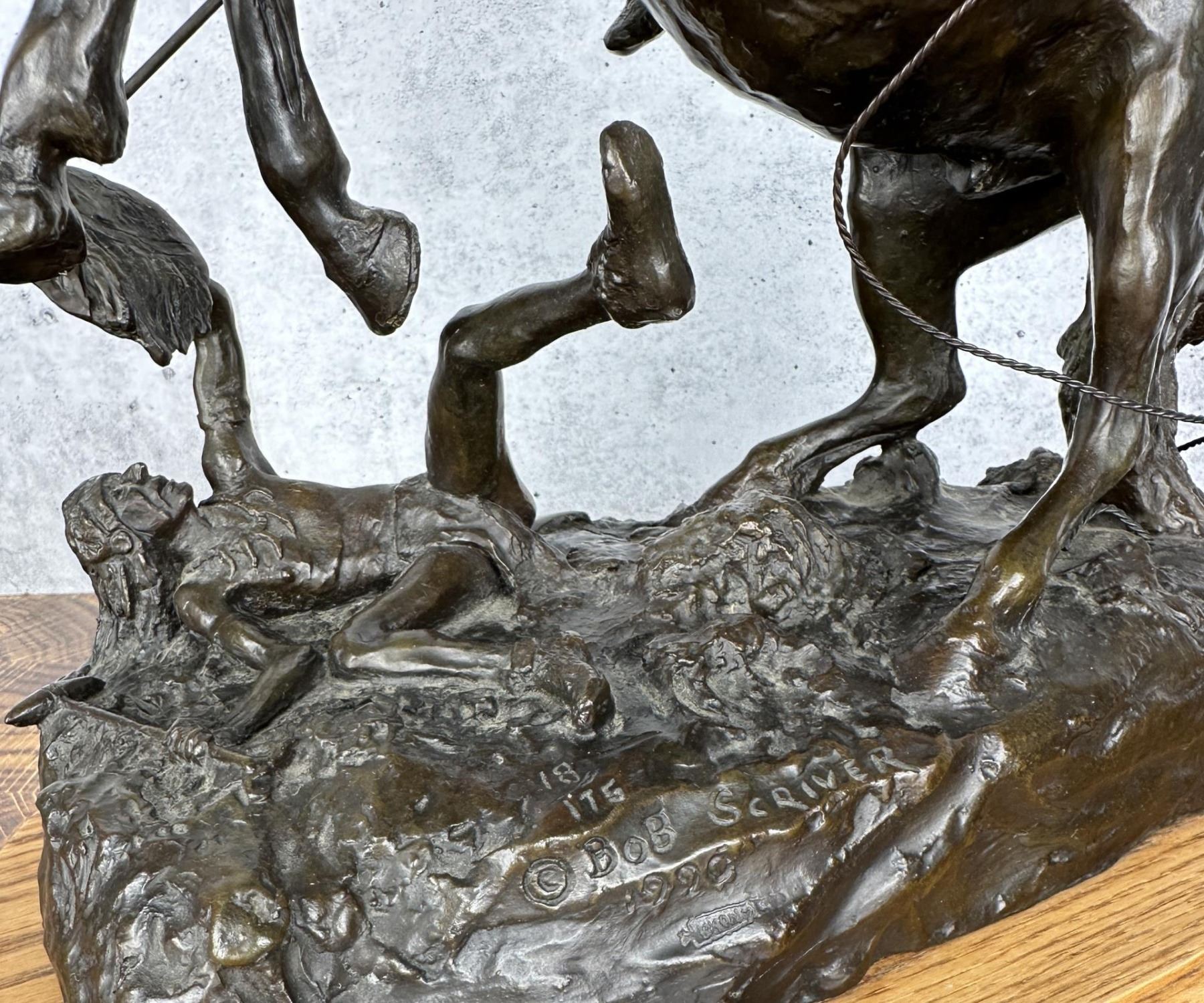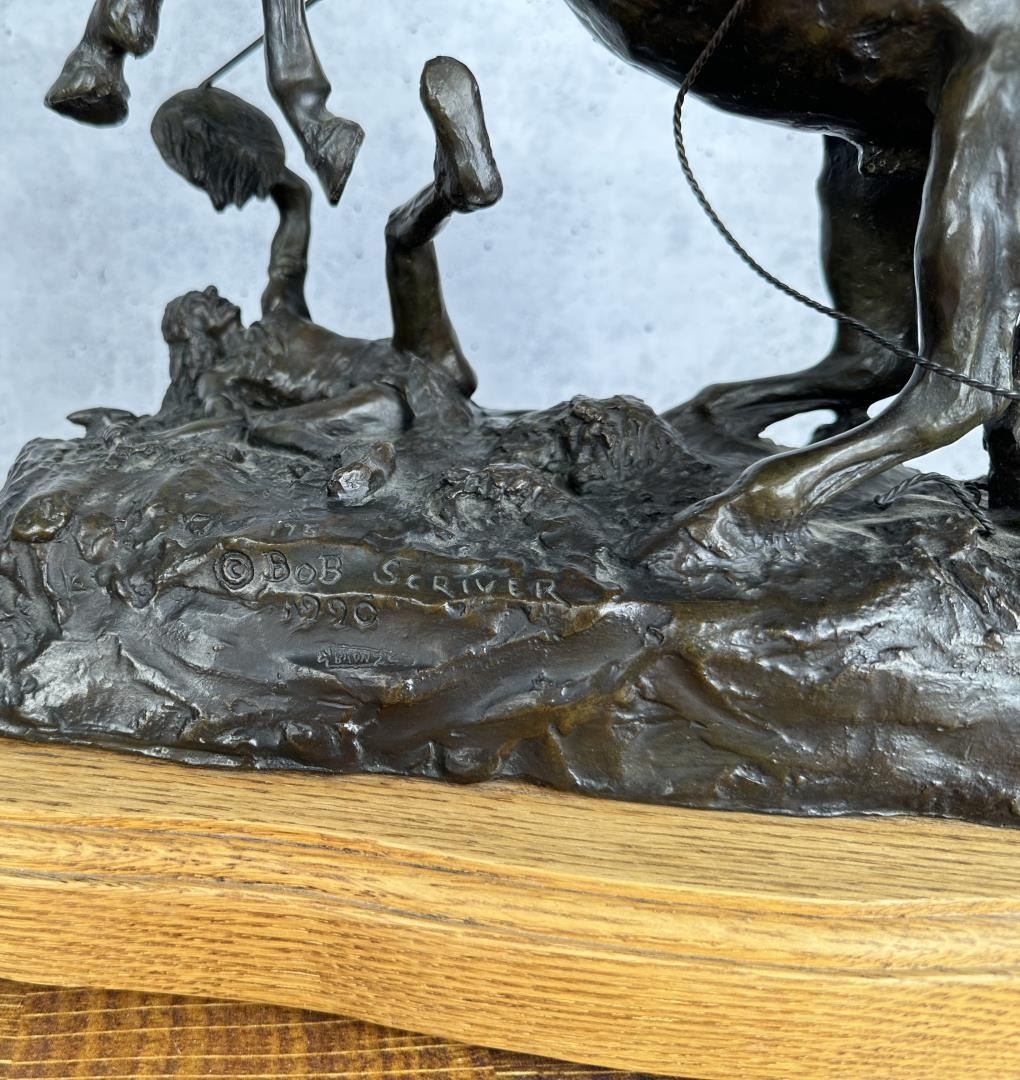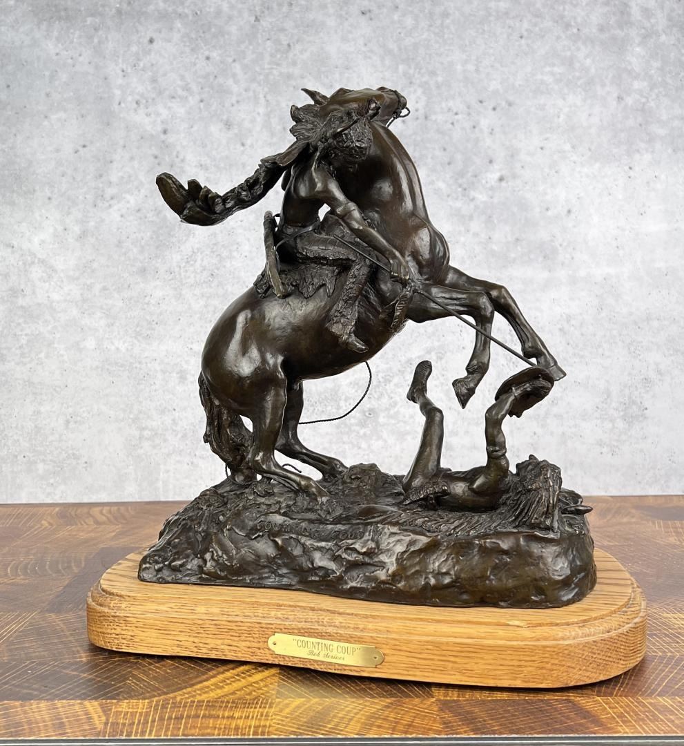 Title is Counting Coup. 15 5/8" by 15 1/4" by 9". Bob (Robert Macfie) Scriver (1914 - 1999) was active/lived in Montana. Bob Scriver is known for Animal and western sculpture. Bob Scriver was an elected member in both the Cowboy Artists of America organization and the National Academy of Western Art. He was a member of the Salmagundi Club and was accepted for membership in the National Sculpture Society. Scriver created heroic sculptures in Montana of the expedition of Lewis and Clark, and in Wyoming of the legendary Buffalo Bill. His Cowboy works include a heroic work of Bill Linderman at the Cowboy Hall of Fame in Oklahoma and his "Rodeo In Bronze" series, one of four belonging to the Devonian Institute in Canada. Scriver was commissioned to do such pieces as a Montana Trapper and belt buckle for the Montana Historical Society to help raise funds to purchase the C.M. Russell painting, When the Land Belonged to God, which raised $96,000.00. In 1981, for the Winchester Arms Company, he was also commissioned to do a famous logo called, The Winchester Rider. This set a new record for contemporary sculptors with gross sales totaling over one million dollars. This edition of 250 was completely sold out in 30 days from the time of National advertising. Scriver's art depicts a sense of freedom that has been lost by the Indian and is seemingly being lost by the cowboy. The Late Dr. Harold McCracken, Director Emeritus of the Whitney Gallery of Western Art, was quoted in the forward of Scriver's book NO MORE BUFFALO as calling Scriver: "America's foremost sculptor today-bar none". Scriver died January 29,1999. He has left behind him stories, and dreams of the West....in bronze.