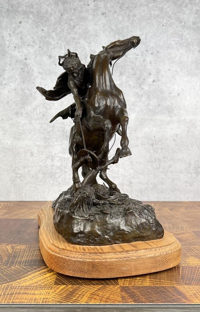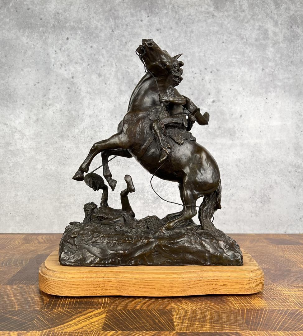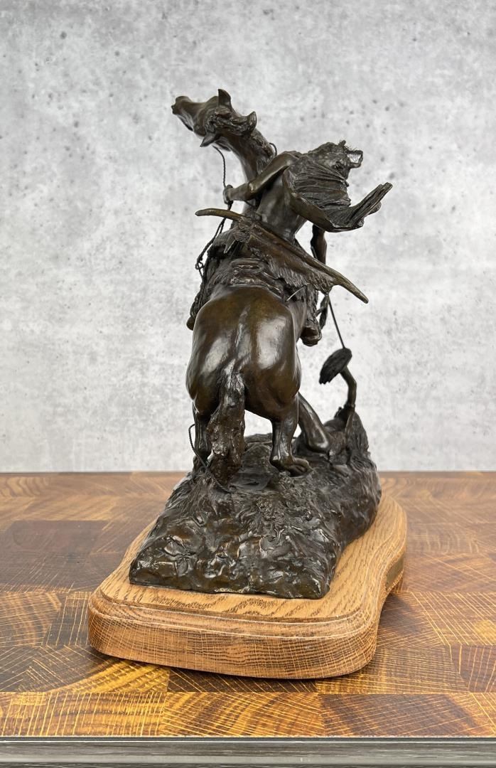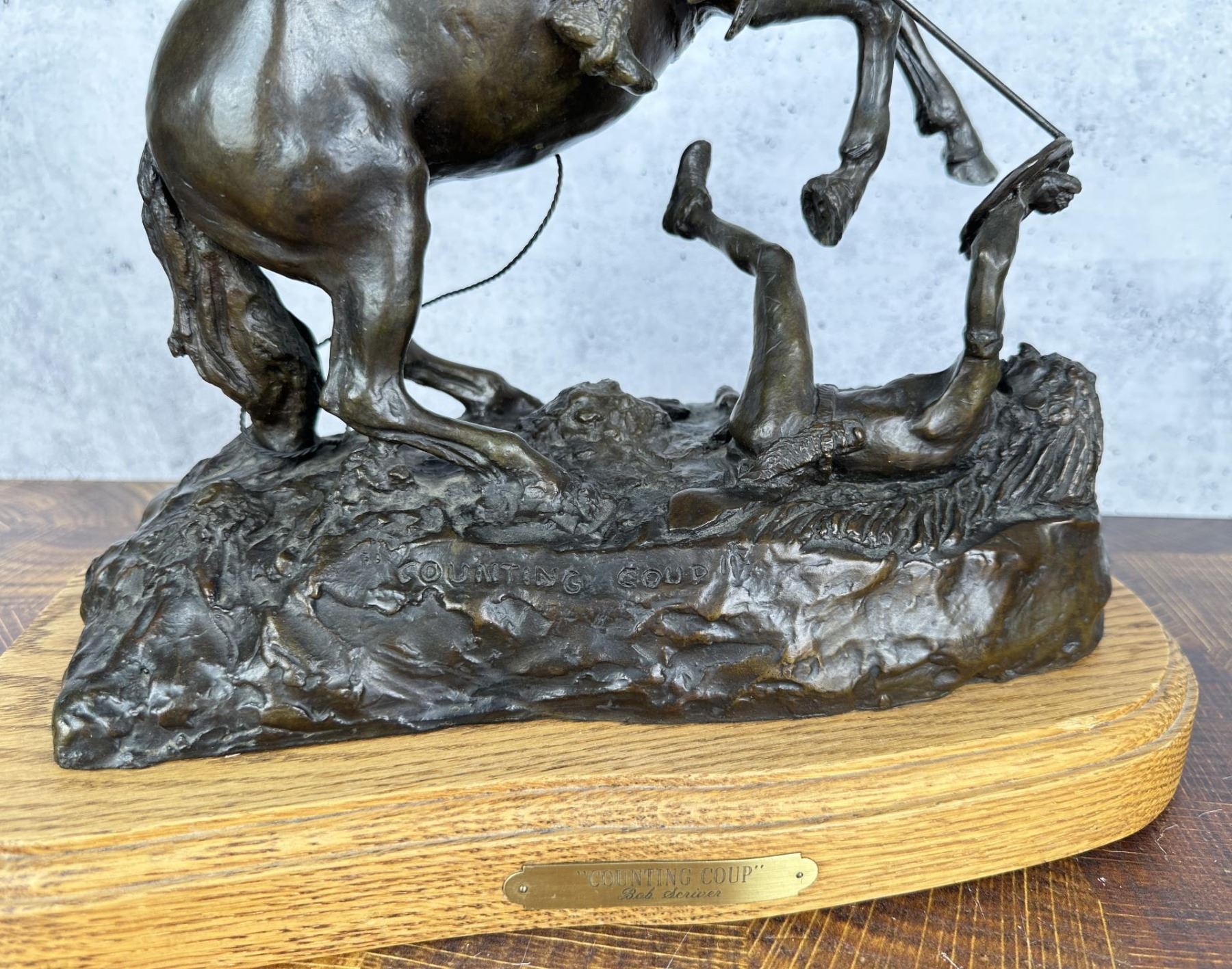 Title is Counting Coup. 15 5/8" by 15 1/4" by 9". Bob (Robert Macfie) Scriver (1914 - 1999) was active/lived in Montana. Bob Scriver is known for Animal and western sculpture. Bob Scriver was an elected member in both the Cowboy Artists of America organization and the National Academy of Western Art. He was a member of the Salmagundi Club and was accepted for membership in the National Sculpture Society. Scriver created heroic sculptures in Montana of the expedition of Lewis and Clark, and in Wyoming of the legendary Buffalo Bill. His Cowboy works include a heroic work of Bill Linderman at the Cowboy Hall of Fame in Oklahoma and his "Rodeo In Bronze" series, one of four belonging to the Devonian Institute in Canada. Scriver was commissioned to do such pieces as a Montana Trapper and belt buckle for the Montana Historical Society to help raise funds to purchase the C.M. Russell painting, When the Land Belonged to God, which raised $96,000.00. In 1981, for the Winchester Arms Company, he was also commissioned to do a famous logo called, The Winchester Rider. This set a new record for contemporary sculptors with gross sales totaling over one million dollars. This edition of 250 was completely sold out in 30 days from the time of National advertising. Scriver's art depicts a sense of freedom that has been lost by the Indian and is seemingly being lost by the cowboy. The Late Dr. Harold McCracken, Director Emeritus of the Whitney Gallery of Western Art, was quoted in the forward of Scriver's book NO MORE BUFFALO as calling Scriver: "America's foremost sculptor today-bar none". Scriver died January 29,1999. He has left behind him stories, and dreams of the West....in bronze.