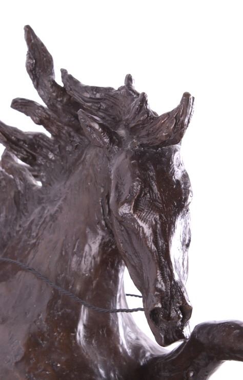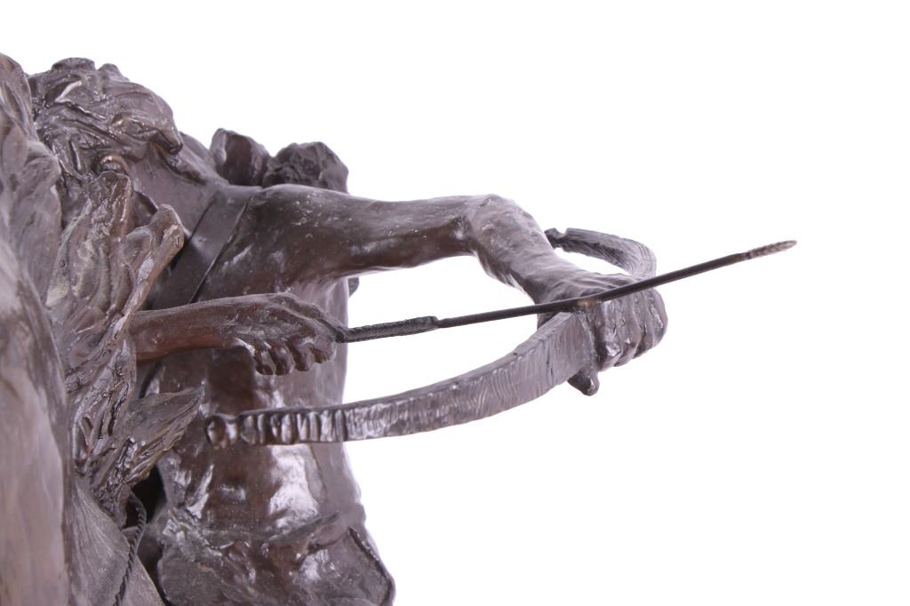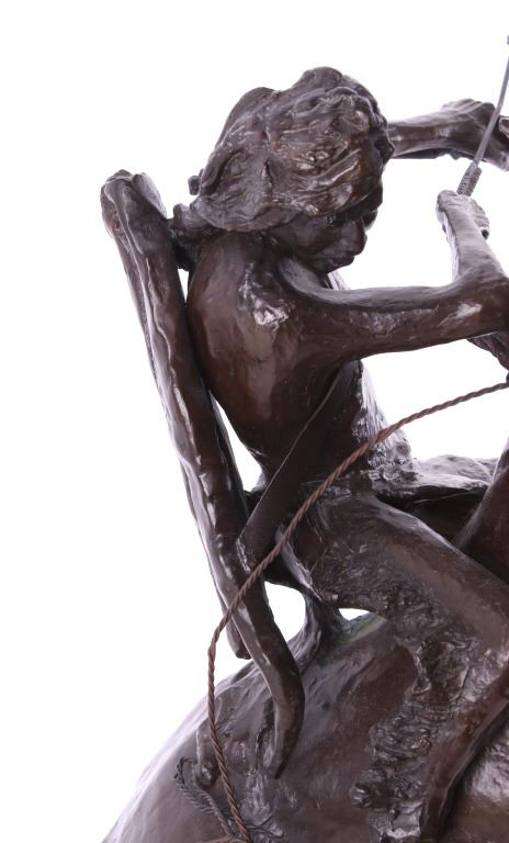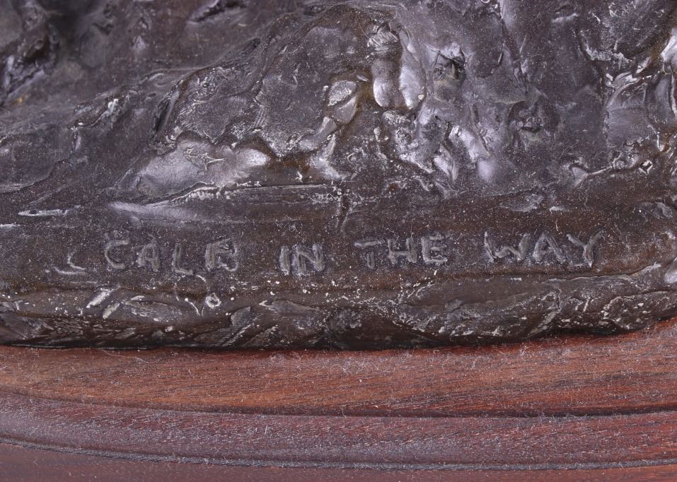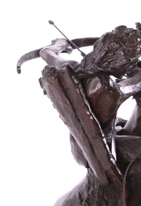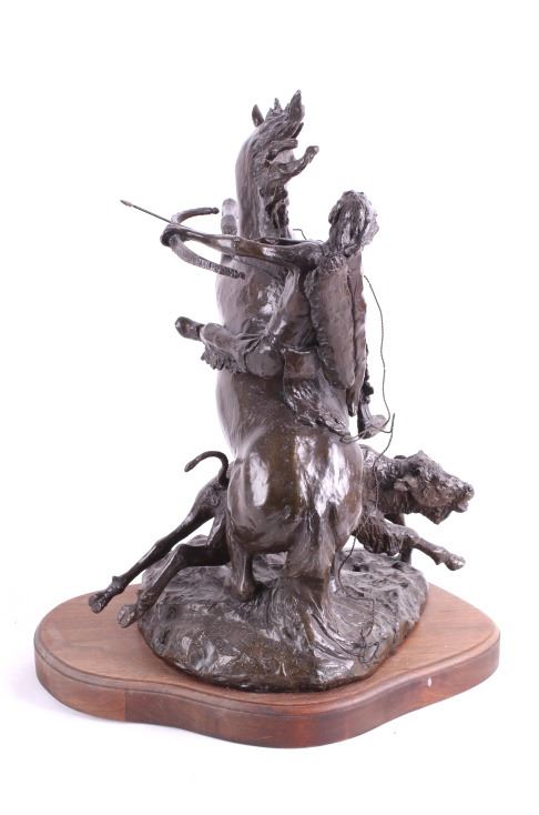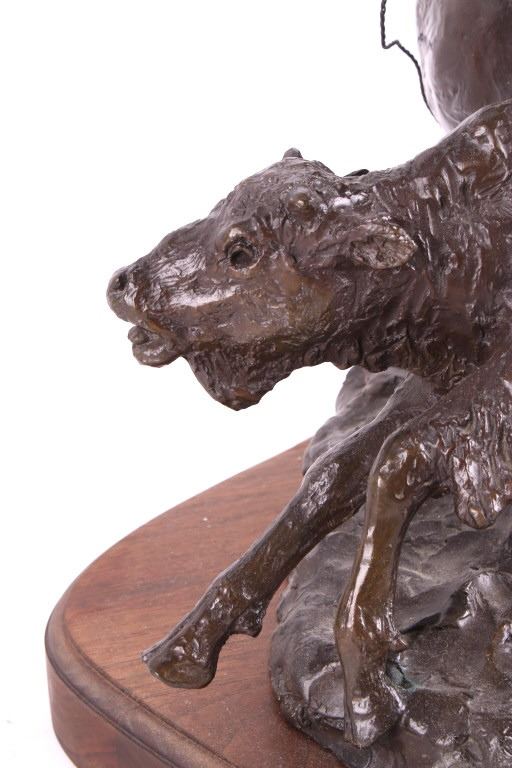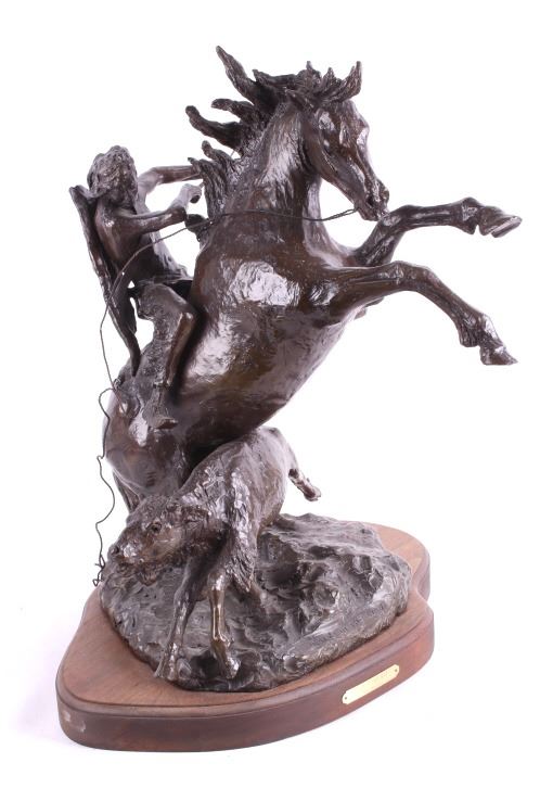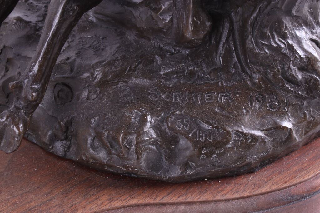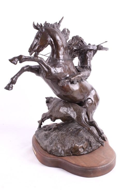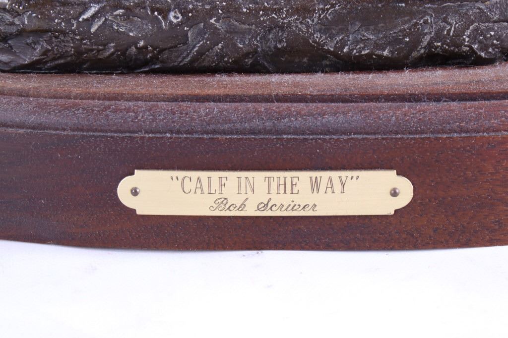 This is an original Bob Scriver bronze sculpture titled "Calf in The Way." This bronze shows a Native American hunter on horseback. A bison calf is running underneath the horse causing it to rear up. The attention to detail in this piece is fantastic. Scriver (1914-1999) was born in Browning, Montana (in the heart of the Blackfoot Indian Reservation) in 1914. Scriver began sculpting using taxidermy to learn his craft of making wildlife bronzes. By 1962 he became a charter member of the Society of Animal Artists, had been accepted into the prestigious Cowboy Artists of America, listed in Who’s Who in American Art, and a member of the National Sculpture Society, and the National Academy of Western Art. This is a Lost Wax Bronze Casting and shows a walnut base. Sculpture measures overall 18” x 17.5" and is 23" tall. Bob Scriver bronzes have been valued at over $30,000-$50,000. He is believed to be "The Cowboy’s National Sculptor" and one of the finest Montana bronze artists of the 20th century. The sculpture comes with a biography of the artists life and certificate of authenticity. The bronze shows very good condition and is numbered 55/150.