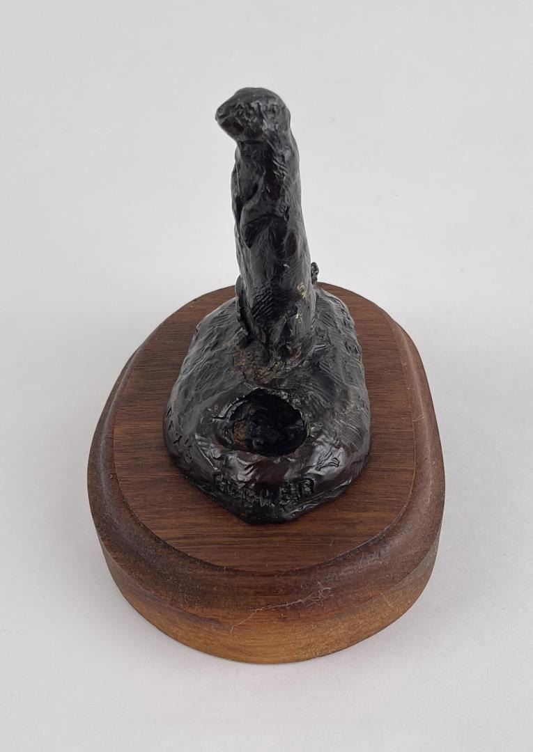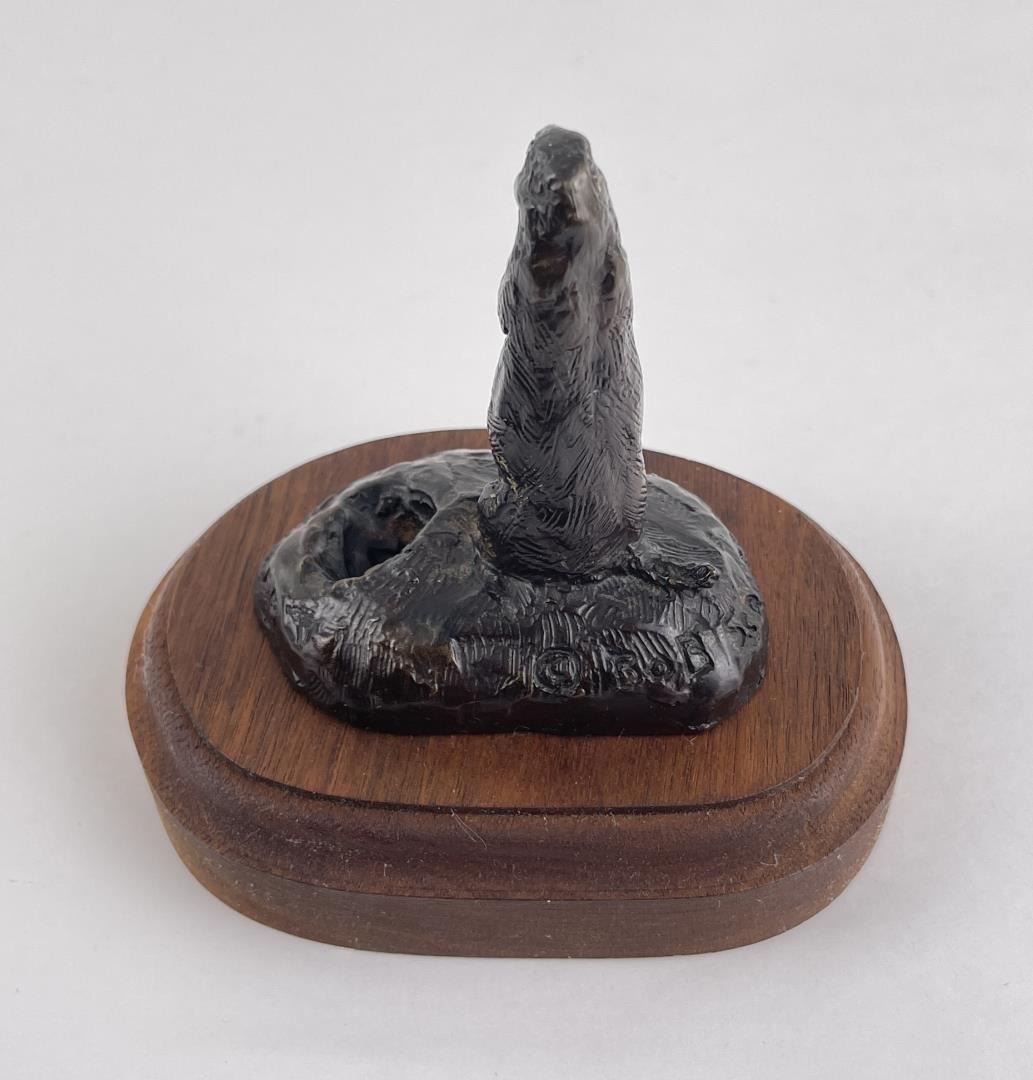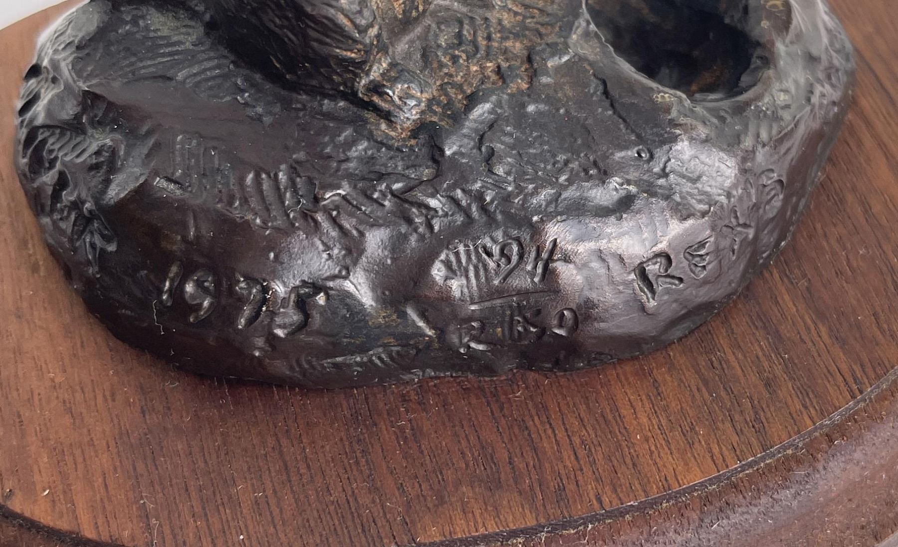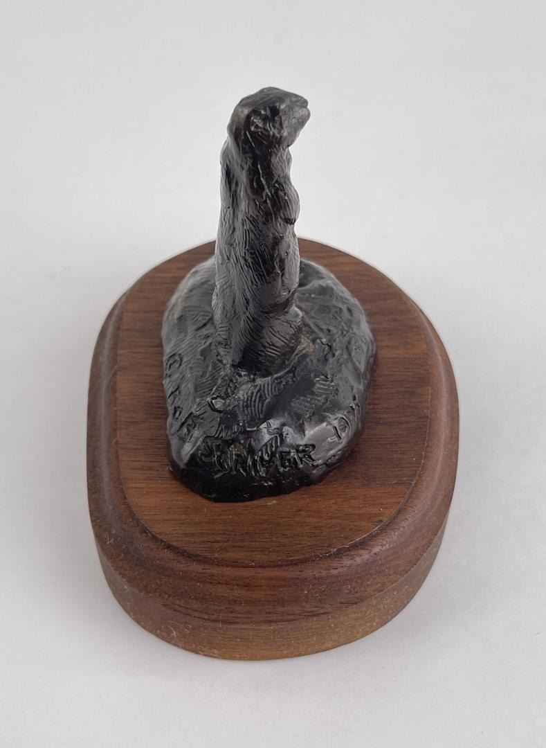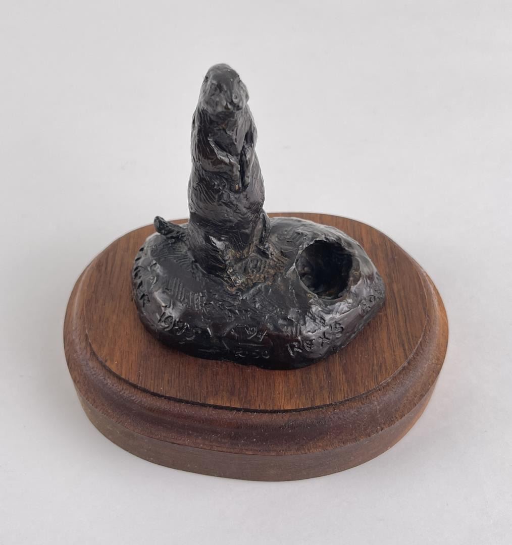 Nice bronze. Portrays Rex's Gopher. Done by Bob Scriver. Measures 4 1/4" tall. Robert "Bob" Macfie Scriver (1914–1999) was a Montana sculptor who was born on the Blackfeet reservation of Anglophone Quebec parents. Scriver was a scholar of Blackfoot Indian culture and history who knew and associated with Blackfoot historian James Willard Schultz in the earlier part of his life. He specialized in western subjects, but it is more accurate to associate him with the American Beaux Arts-educated sculptors who became prominent at the turn of the 19th century. His first efforts were small inexpensive souvenir wildlife figurines cast in plaster and air-brushed in natural colors. A parallel career in taxidermy and a fondness for hunting supported the increasingly accurate portrayals of these animals.