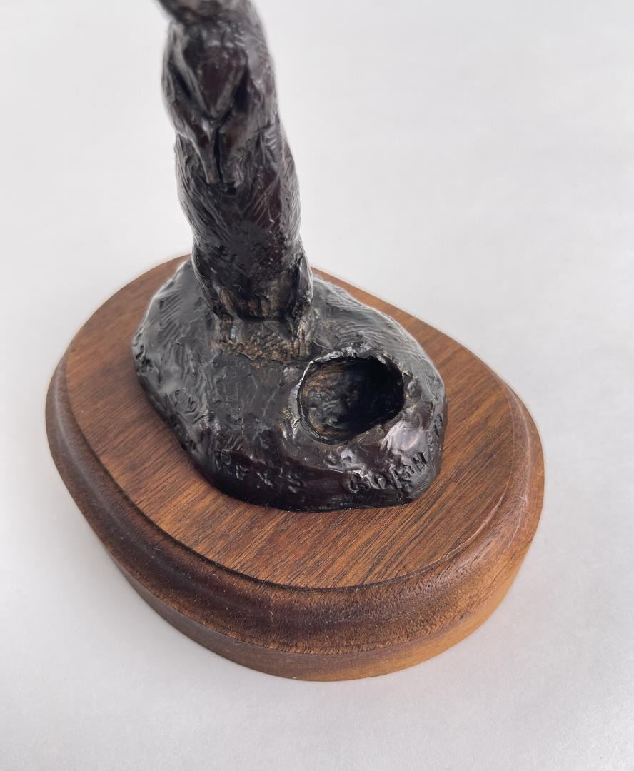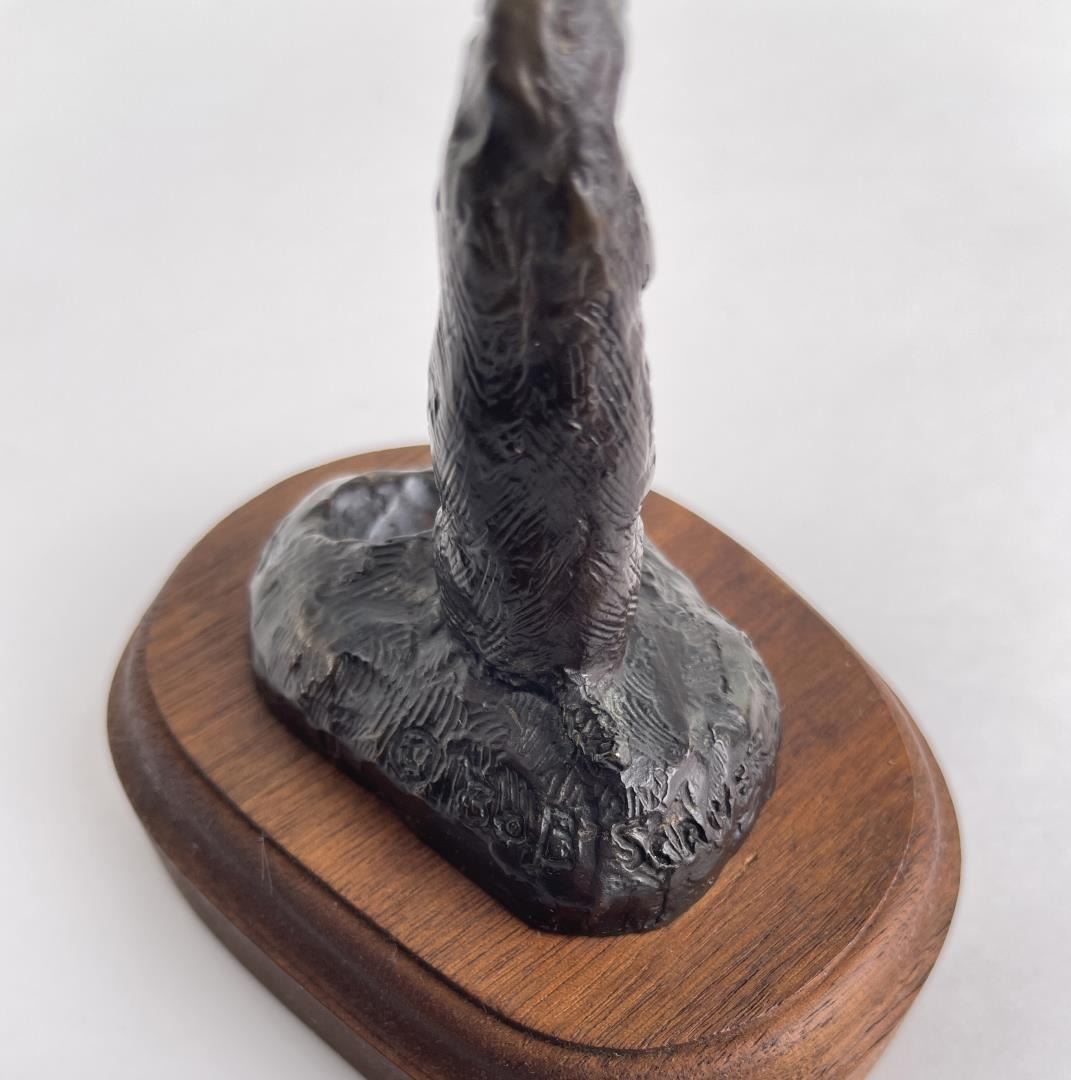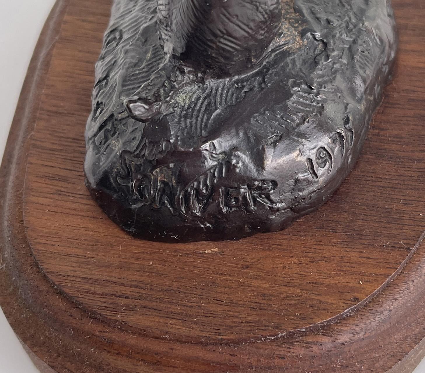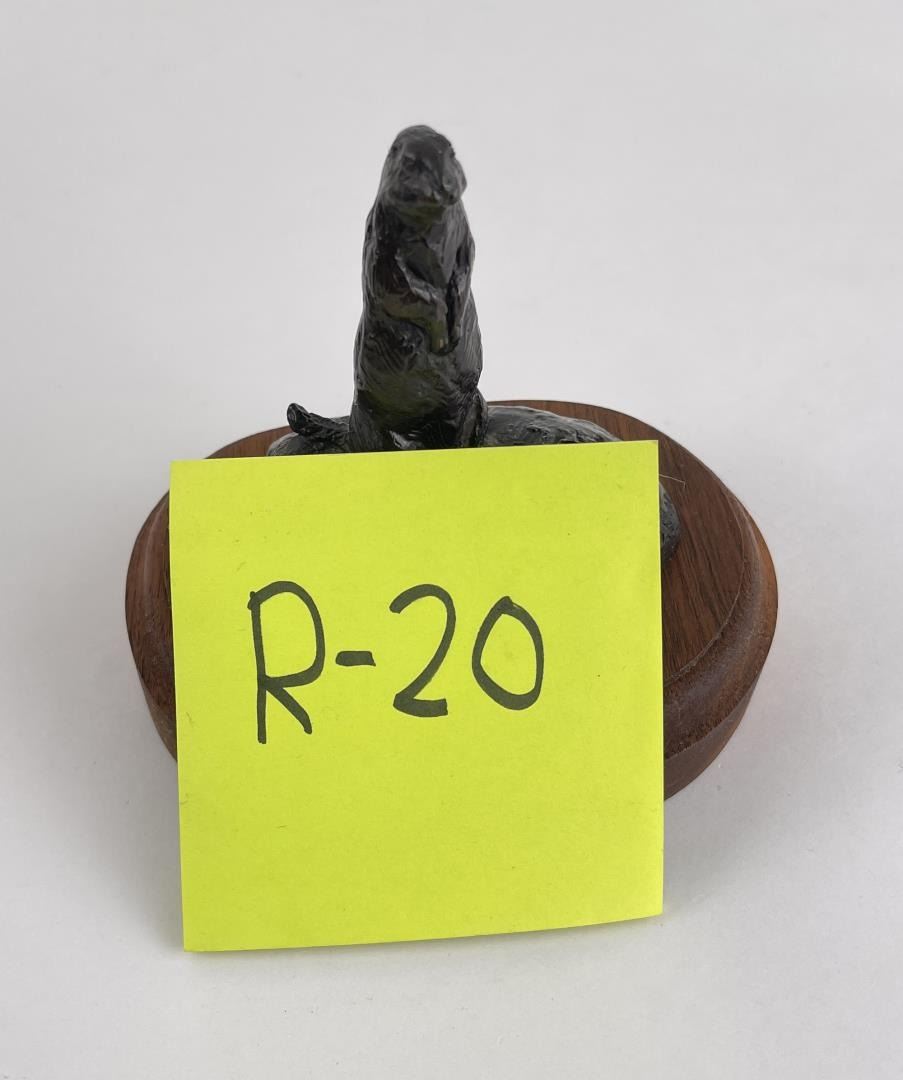Nice bronze. Portrays Rex's Gopher. Done by Bob Scriver. Measures 4 1/4" tall. Robert "Bob" Macfie Scriver (1914–1999) was a Montana sculptor who was born on the Blackfeet reservation of Anglophone Quebec parents. Scriver was a scholar of Blackfoot Indian culture and history who knew and associated with Blackfoot historian James Willard Schultz in the earlier part of his life. He specialized in western subjects, but it is more accurate to associate him with the American Beaux Arts-educated sculptors who became prominent at the turn of the 19th century. His first efforts were small inexpensive souvenir wildlife figurines cast in plaster and air-brushed in natural colors. A parallel career in taxidermy and a fondness for hunting supported the increasingly accurate portrayals of these animals.