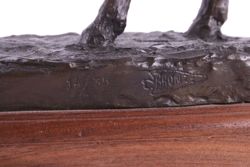 For your bidding pleasure is an original Bob Scriver "Spring Storm" bronze sculpture numbered 14/35. This bronze depicts a rancher bringing in a calf while on horse back. The images are in a battle with the elements as the horse braces his head and the rancher grabs his hat as the head into the wind. Robert Macfie Scriver (1914-1999) was born in Browning, Montana (in the heart of the Blackfoot Indian Reservation) in 1914. Scriver began sculpting using taxidermy to learn his craft of making wildlife bronzes. By 1962 he became a charter member of the Society of Animal Artists, had been accepted into the prestigious Cowboy Artists of America, listed in Who’s Who in American Art, and a member of the National Sculpture Society, and the National Academy of Western Art. This is a Lost Wax Bronze Casting and shows a hardwood base. Sculpture shows very good condition and measures overall 4.5" x 12" and is 11.5" tall. Bob Scriver bronzes have been valued at over $30,000-$50,000. He is believed to be "The Cowboy’s National Sculptor" and one of the finest Montana bronze artists of the 20th century.