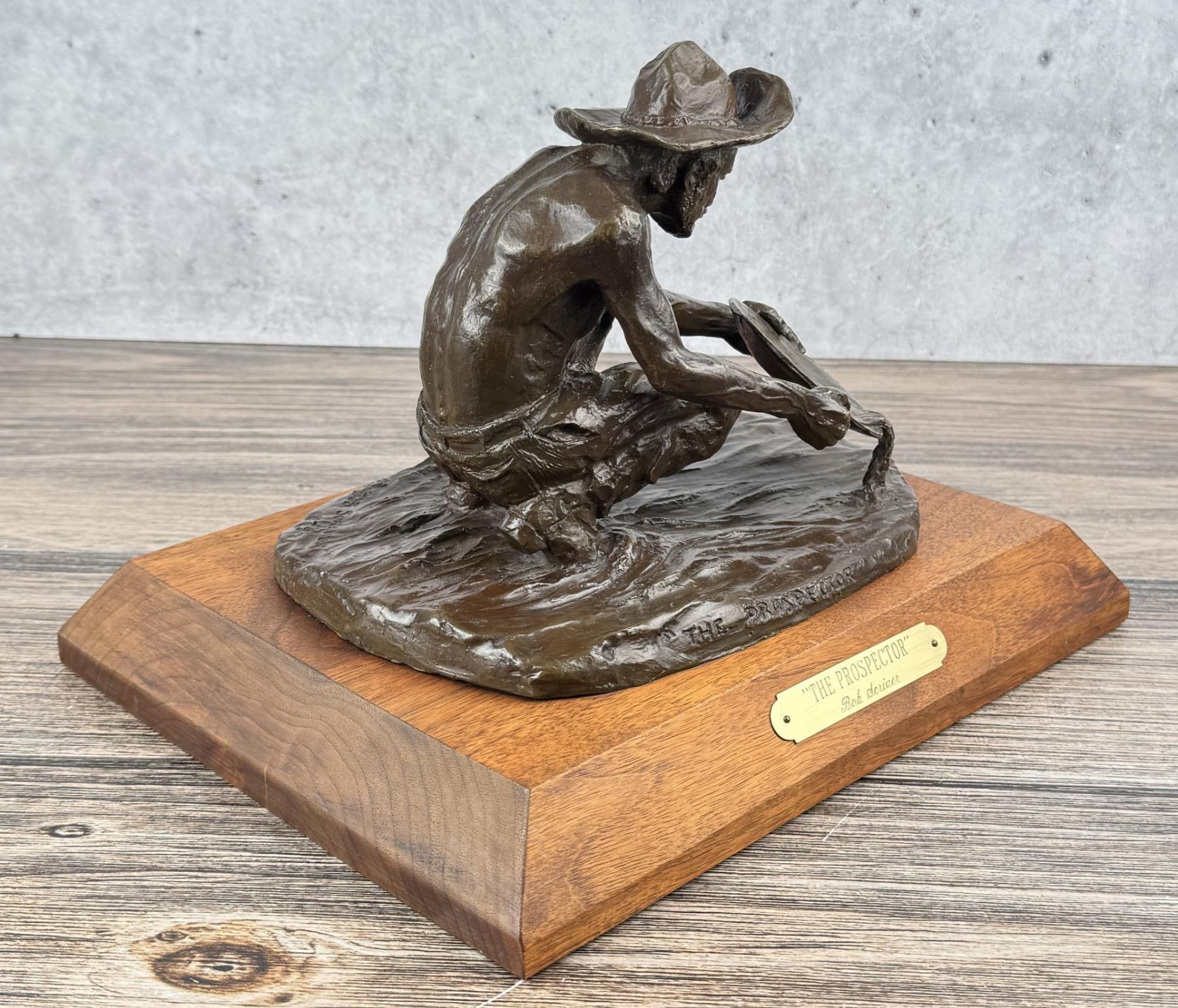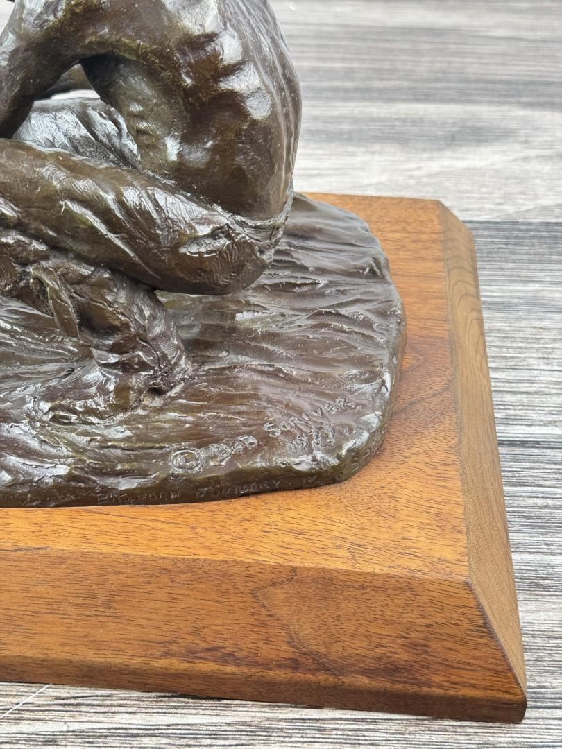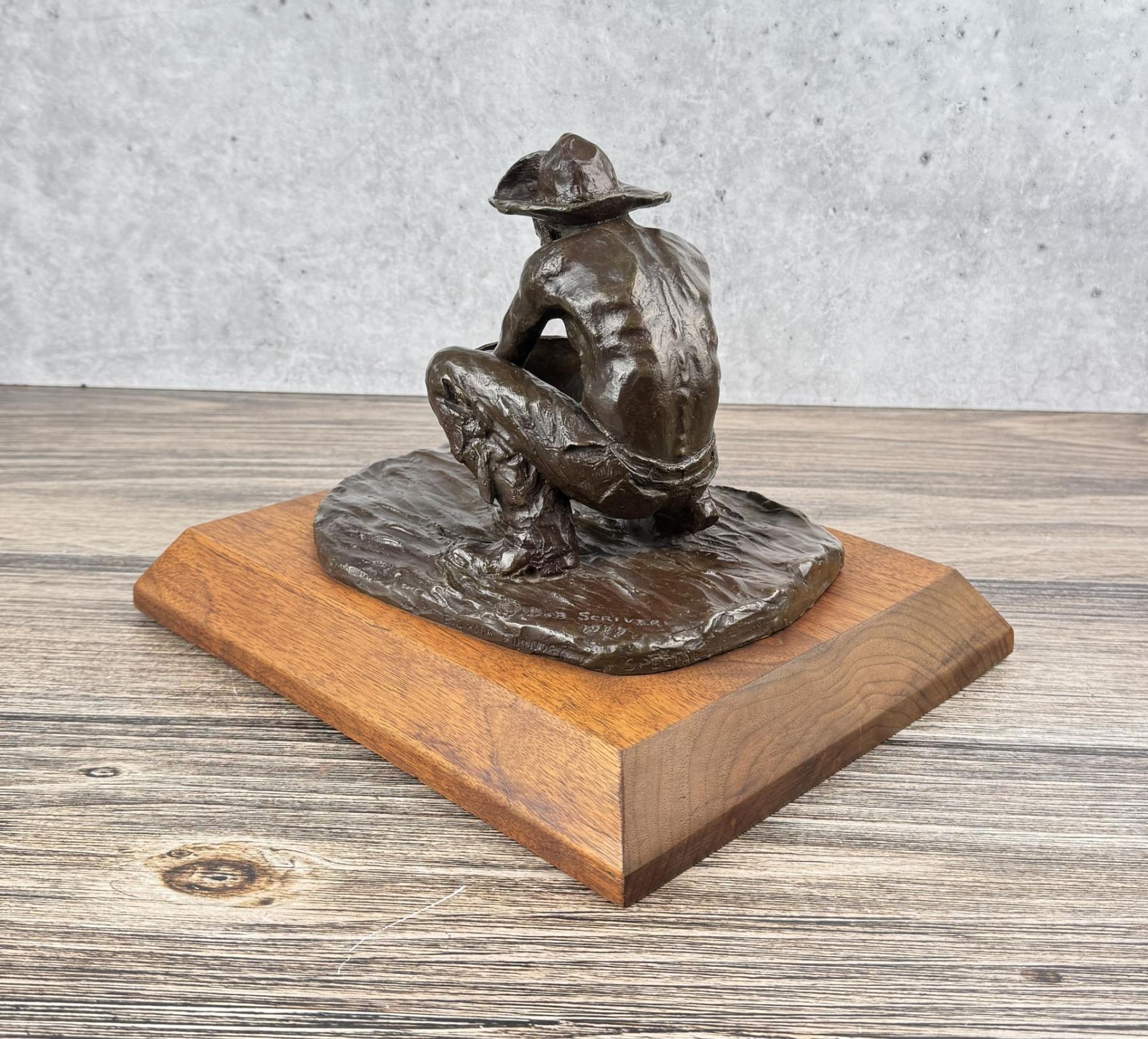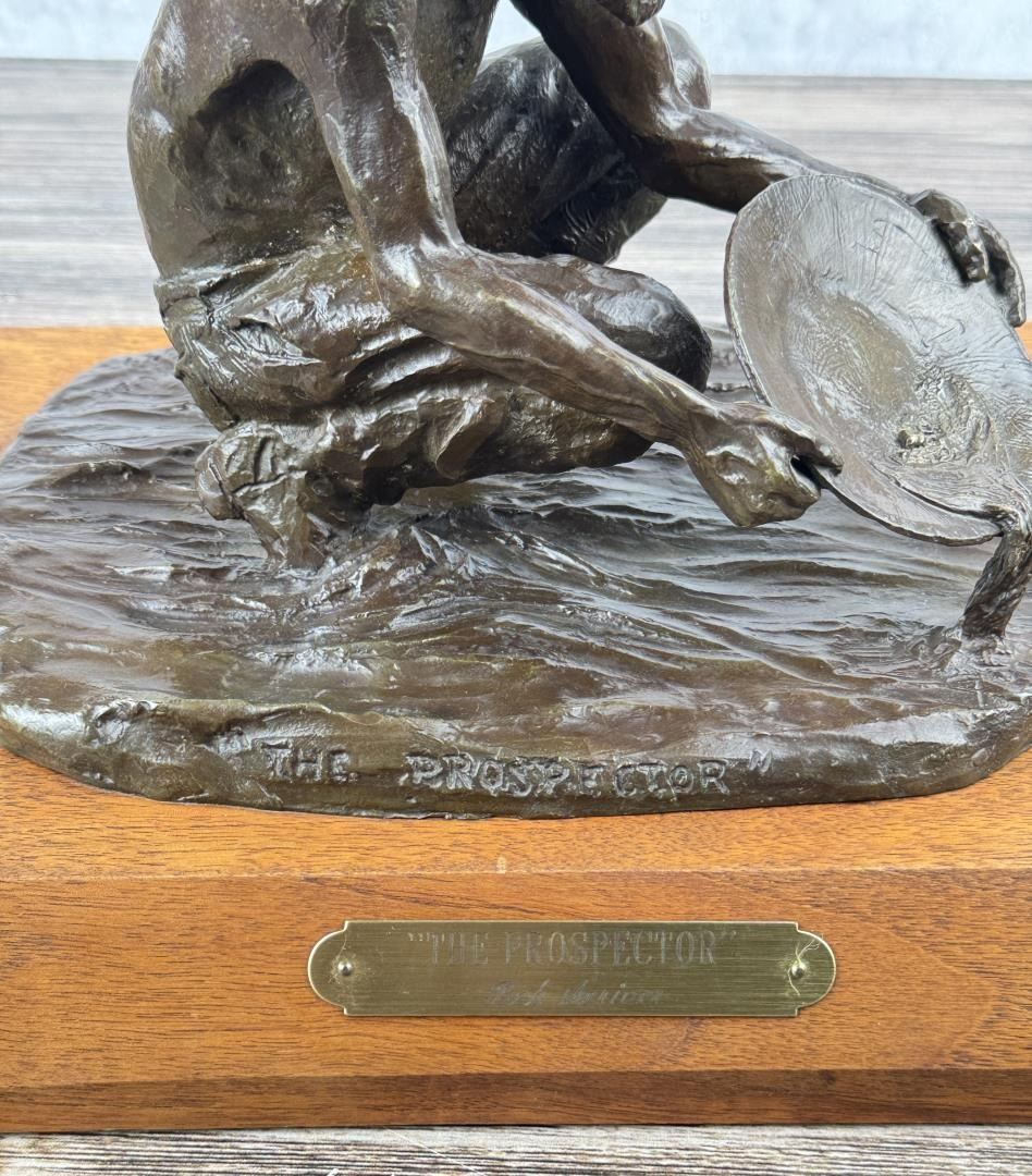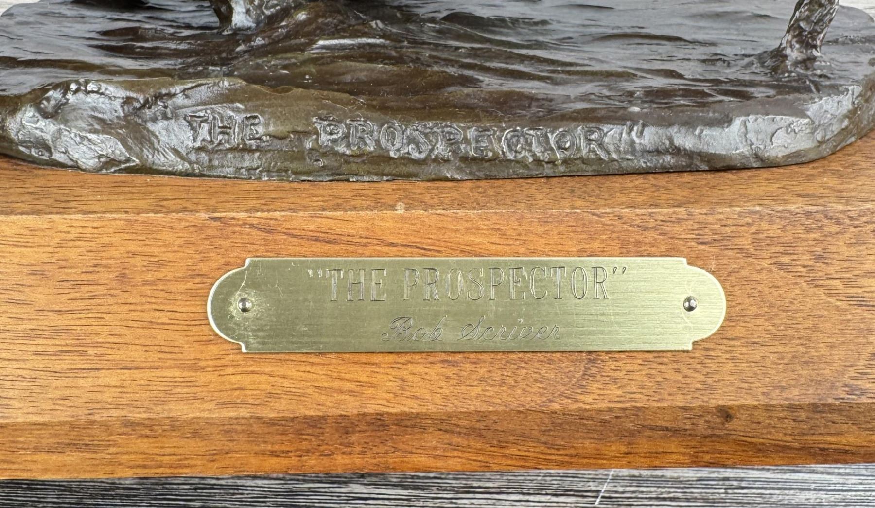 Title is The Prospector. Big Horn Foundry. 12 1/8" by 9 3/4" by 8 1/2". Bob (Robert Macfie) Scriver (1914 - 1999) was active/lived in Montana. Bob Scriver is known for Animal and western sculpture. Bob Scriver was an elected member in both the Cowboy Artists of America organization and the National Academy of Western Art. He was a member of the Salmagundi Club and was accepted for membership in the National Sculpture Society. Scriver created heroic sculptures in Montana of the expedition of Lewis and Clark, and in Wyoming of the legendary Buffalo Bill. His Cowboy works include a heroic work of Bill Linderman at the Cowboy Hall of Fame in Oklahoma and his "Rodeo In Bronze" series, one of four belonging to the Devonian Institute in Canada. Scriver was commissioned to do such pieces as a Montana Trapper and belt buckle for the Montana Historical Society to help raise funds to purchase the C.M. Russell painting, When the Land Belonged to God, which raised $96,000.00. In 1981, for the Winchester Arms Company, he was also commissioned to do a famous logo called, The Winchester Rider. This set a new record for contemporary sculptors with gross sales totaling over one million dollars. This edition of 250 was completely sold out in 30 days from the time of National advertising. Scriver's art depicts a sense of freedom that has been lost by the Indian and is seemingly being lost by the cowboy. The Late Dr. Harold McCracken, Director Emeritus of the Whitney Gallery of Western Art, was quoted in the forward of Scriver's book NO MORE BUFFALO as calling Scriver: "America's foremost sculptor today-bar none". Scriver died January 29,1999. He has left behind him stories, and dreams of the West....in bronze.