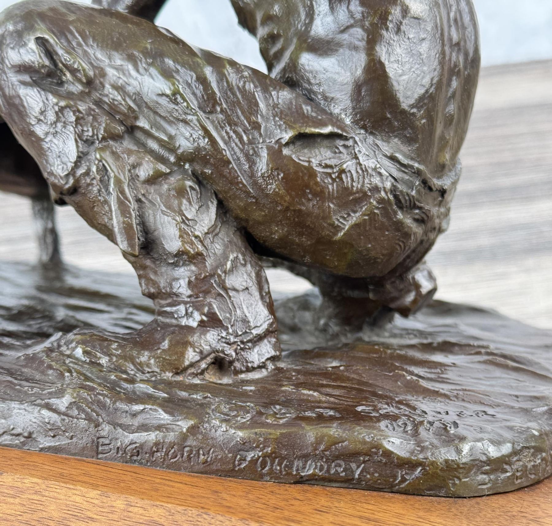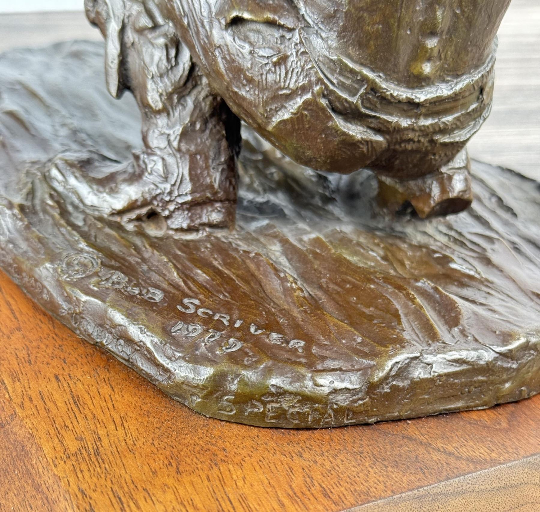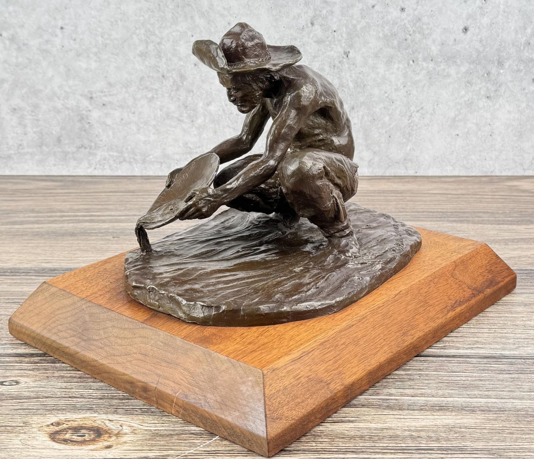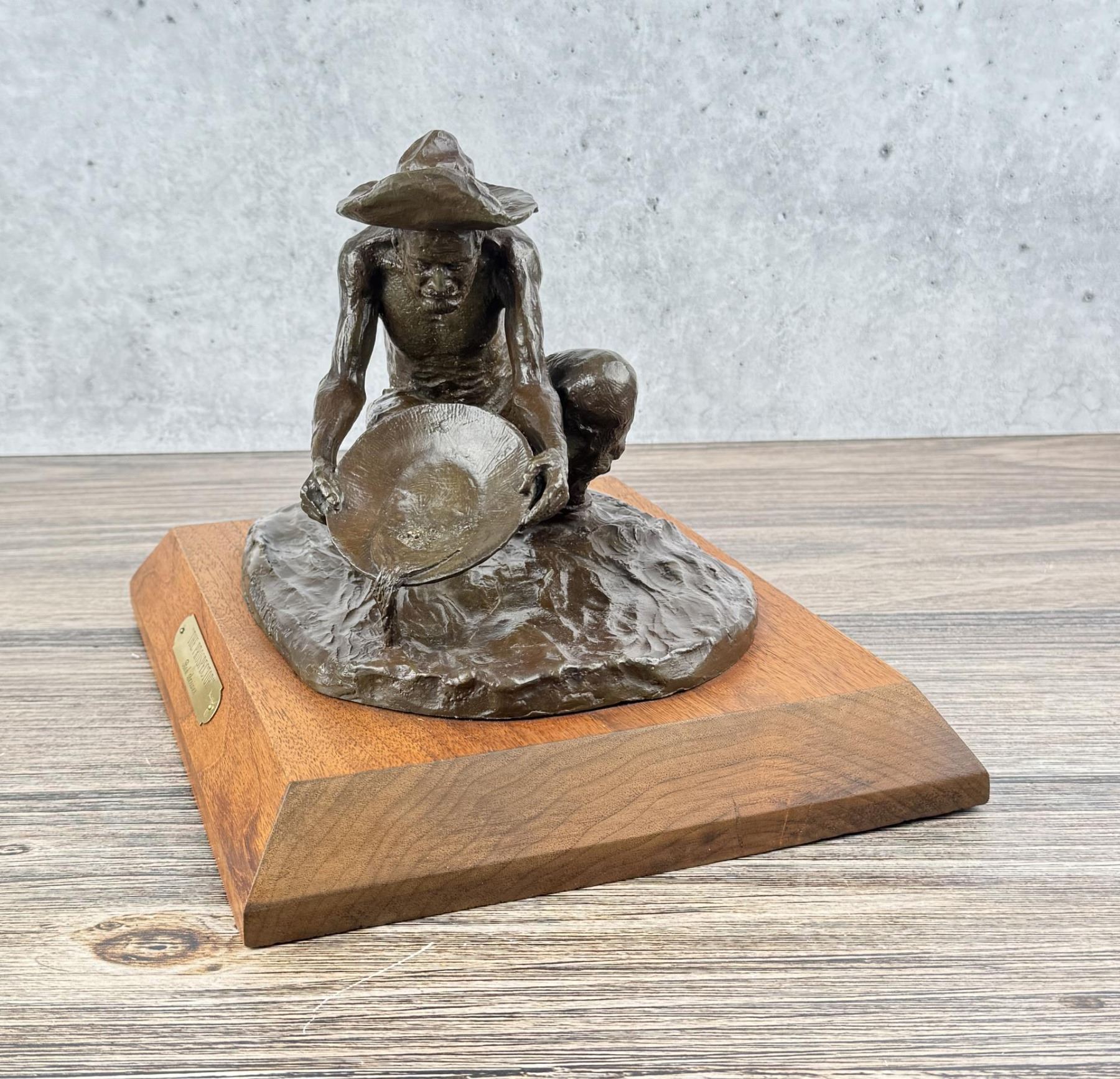 Title is The Prospector. Big Horn Foundry. 12 1/8" by 9 3/4" by 8 1/2". Bob (Robert Macfie) Scriver (1914 - 1999) was active/lived in Montana. Bob Scriver is known for Animal and western sculpture. Bob Scriver was an elected member in both the Cowboy Artists of America organization and the National Academy of Western Art. He was a member of the Salmagundi Club and was accepted for membership in the National Sculpture Society. Scriver created heroic sculptures in Montana of the expedition of Lewis and Clark, and in Wyoming of the legendary Buffalo Bill. His Cowboy works include a heroic work of Bill Linderman at the Cowboy Hall of Fame in Oklahoma and his "Rodeo In Bronze" series, one of four belonging to the Devonian Institute in Canada. Scriver was commissioned to do such pieces as a Montana Trapper and belt buckle for the Montana Historical Society to help raise funds to purchase the C.M. Russell painting, When the Land Belonged to God, which raised $96,000.00. In 1981, for the Winchester Arms Company, he was also commissioned to do a famous logo called, The Winchester Rider. This set a new record for contemporary sculptors with gross sales totaling over one million dollars. This edition of 250 was completely sold out in 30 days from the time of National advertising. Scriver's art depicts a sense of freedom that has been lost by the Indian and is seemingly being lost by the cowboy. The Late Dr. Harold McCracken, Director Emeritus of the Whitney Gallery of Western Art, was quoted in the forward of Scriver's book NO MORE BUFFALO as calling Scriver: "America's foremost sculptor today-bar none". Scriver died January 29,1999. He has left behind him stories, and dreams of the West....in bronze.
