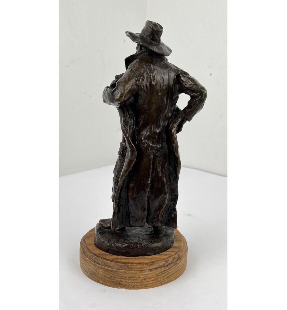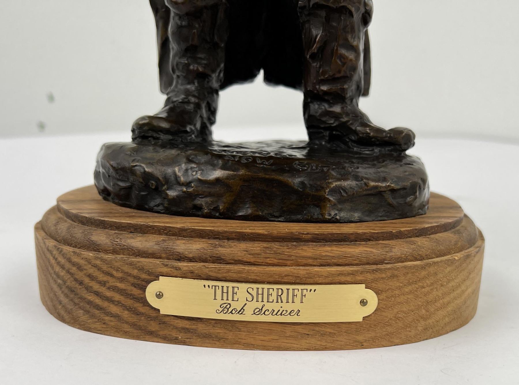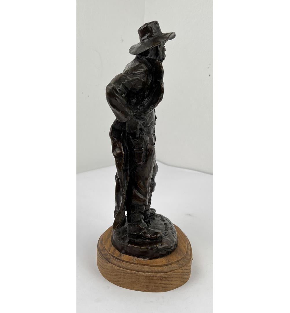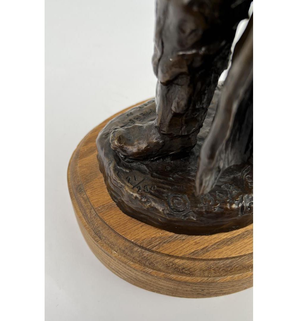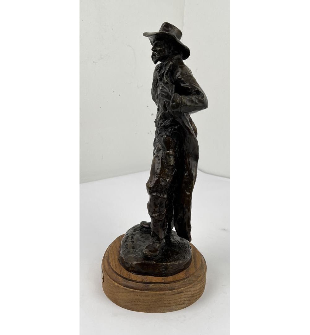 Approximately 14" tall. Bob (Robert Macfie) Scriver (1914 - 1999) was active/lived in Montana. Bob Scriver is known for Animal and western sculpture. Bob Scriver was an elected member in both the Cowboy Artists of America organization and the National Academy of Western Art. He was a member of the Salmagundi Club and was accepted for membership in the National Sculpture Society. Scriver created heroic sculptures in Montana of the expedition of Lewis and Clark, and in Wyoming of the legendary Buffalo Bill. His Cowboy works include a heroic work of Bill Linderman at the Cowboy Hall of Fame in Oklahoma and his "Rodeo In Bronze" series, one of four belonging to the Devonian Institute in Canada. Scriver was commissioned to do such pieces as a Montana Trapper and belt buckle for the Montana Historical Society to help raise funds to purchase the C.M. Russell painting, When the Land Belonged to God, which raised $96,000.00. In 1981, for the Winchester Arms Company, he was also commissioned to do a famous logo called, The Winchester Rider. This set a new record for contemporary sculptors with gross sales totaling over one million dollars. This edition of 250 was completely sold out in 30 days from the time of National advertising. Scriver's art depicts a sense of freedom that has been lost by the Indian and is seemingly being lost by the cowboy. The Late Dr. Harold McCracken, Director Emeritus of the Whitney Gallery of Western Art, was quoted in the forward of Scriver's book NO MORE BUFFALO as calling Scriver: "America's foremost sculptor today-bar none". Scriver died January 29,1999. He has left behind him stories, and dreams of the West....in bronze.