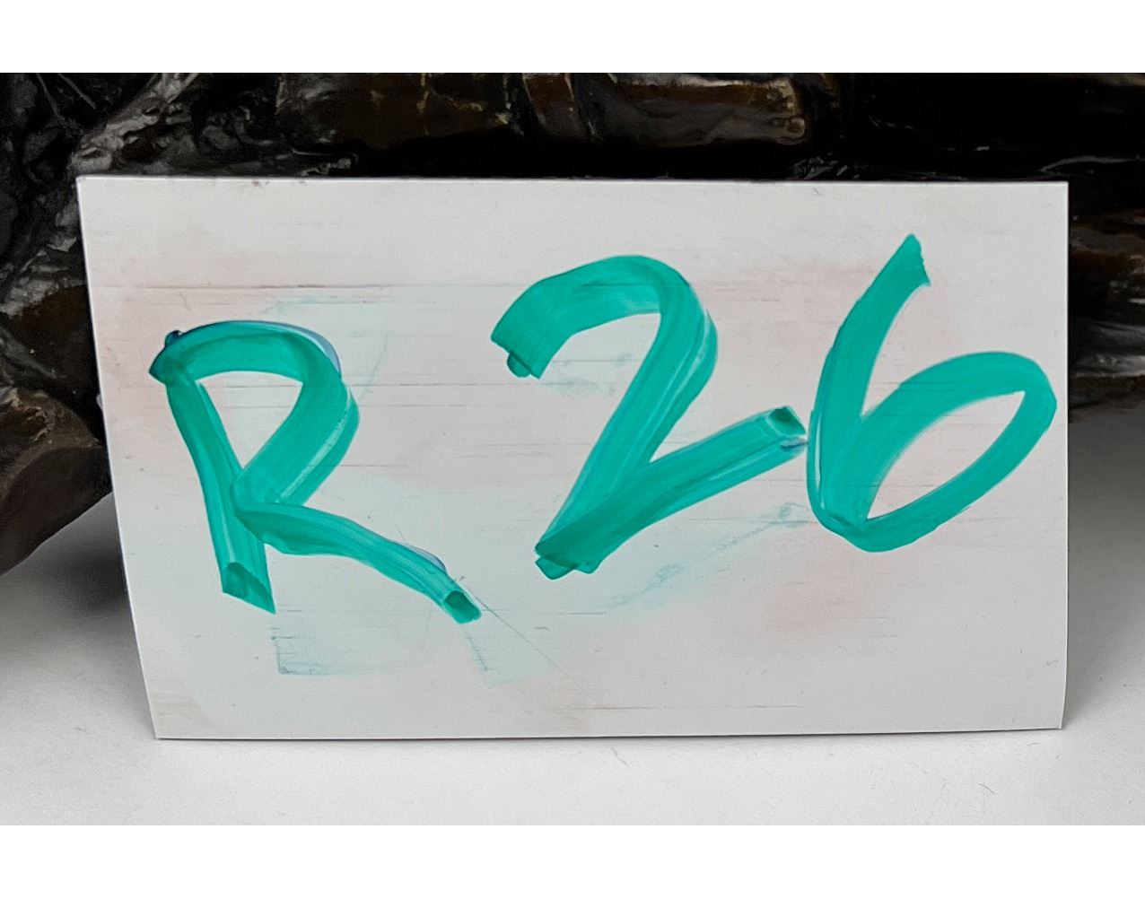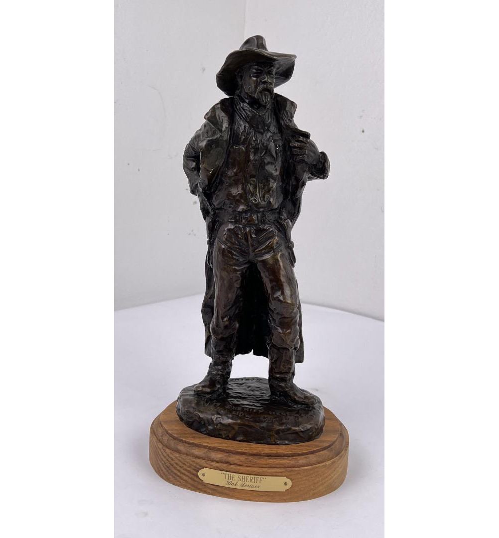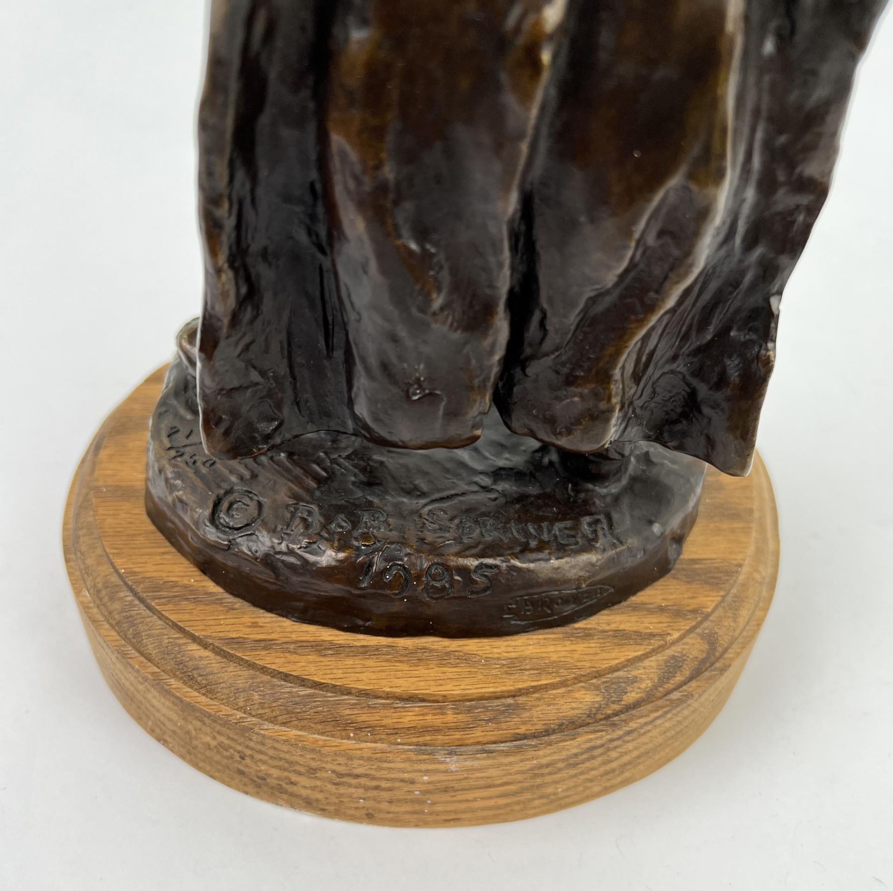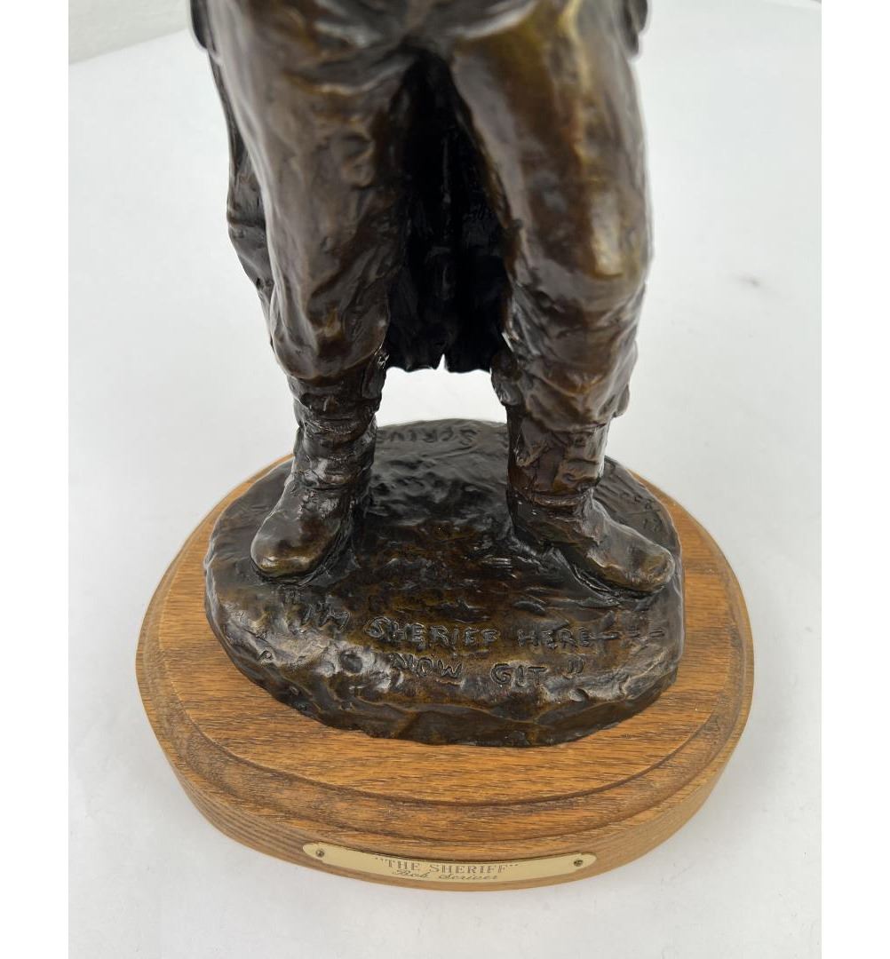 Approximately 14" tall. Bob (Robert Macfie) Scriver (1914 - 1999) was active/lived in Montana. Bob Scriver is known for Animal and western sculpture. Bob Scriver was an elected member in both the Cowboy Artists of America organization and the National Academy of Western Art. He was a member of the Salmagundi Club and was accepted for membership in the National Sculpture Society. Scriver created heroic sculptures in Montana of the expedition of Lewis and Clark, and in Wyoming of the legendary Buffalo Bill. His Cowboy works include a heroic work of Bill Linderman at the Cowboy Hall of Fame in Oklahoma and his "Rodeo In Bronze" series, one of four belonging to the Devonian Institute in Canada. Scriver was commissioned to do such pieces as a Montana Trapper and belt buckle for the Montana Historical Society to help raise funds to purchase the C.M. Russell painting, When the Land Belonged to God, which raised $96,000.00. In 1981, for the Winchester Arms Company, he was also commissioned to do a famous logo called, The Winchester Rider. This set a new record for contemporary sculptors with gross sales totaling over one million dollars. This edition of 250 was completely sold out in 30 days from the time of National advertising. Scriver's art depicts a sense of freedom that has been lost by the Indian and is seemingly being lost by the cowboy. The Late Dr. Harold McCracken, Director Emeritus of the Whitney Gallery of Western Art, was quoted in the forward of Scriver's book NO MORE BUFFALO as calling Scriver: "America's foremost sculptor today-bar none". Scriver died January 29,1999. He has left behind him stories, and dreams of the West....in bronze.