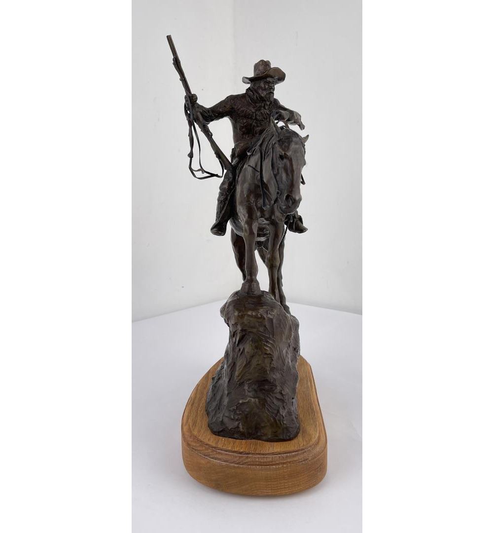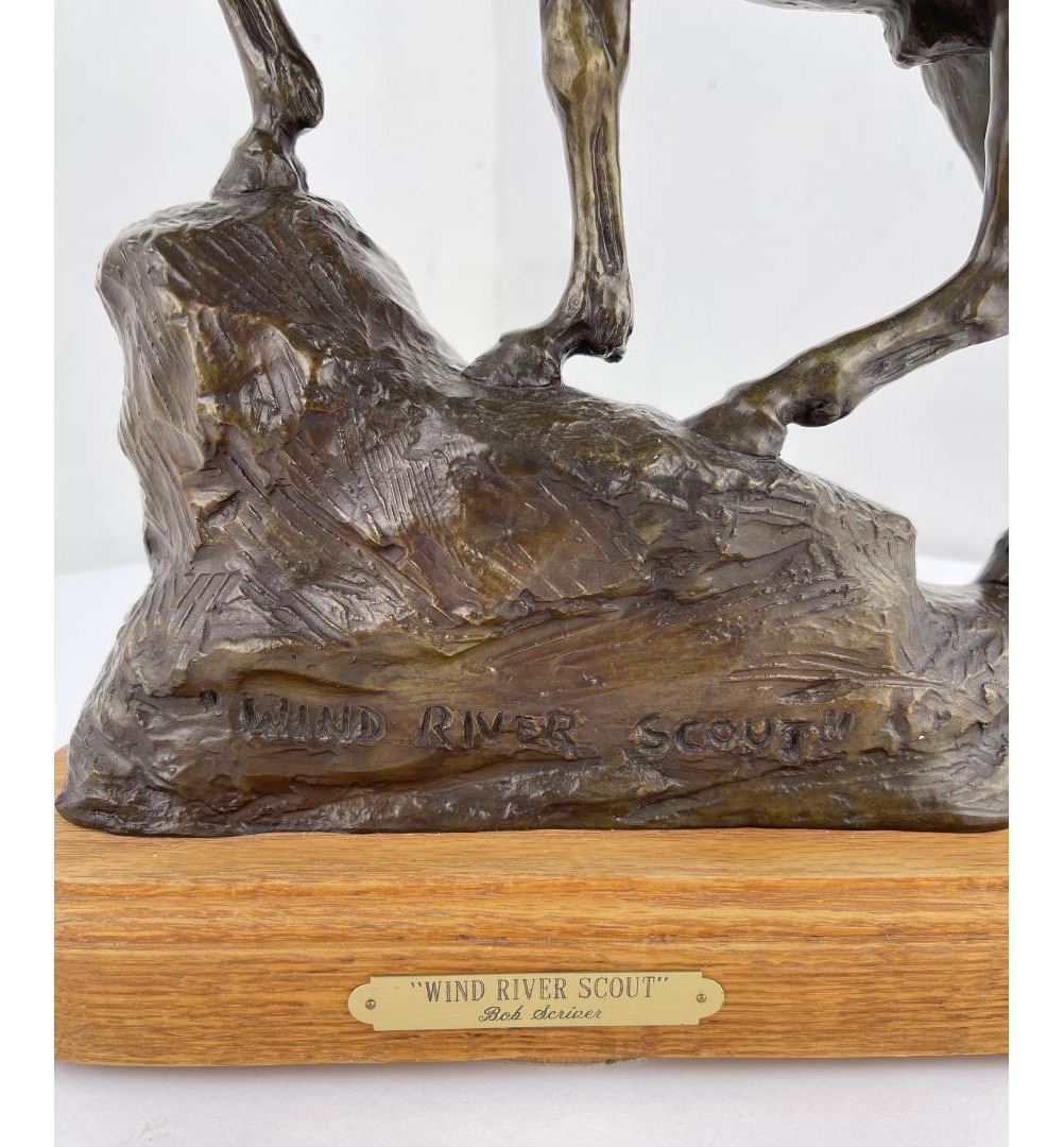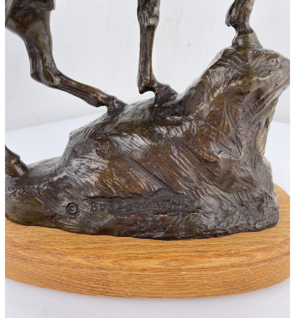 Approximately 18" tall. Bob (Robert Macfie) Scriver (1914 - 1999) was active/lived in Montana. Bob Scriver is known for Animal and western sculpture. Bob Scriver was an elected member in both the Cowboy Artists of America organization and the National Academy of Western Art. He was a member of the Salmagundi Club and was accepted for membership in the National Sculpture Society. Scriver created heroic sculptures in Montana of the expedition of Lewis and Clark, and in Wyoming of the legendary Buffalo Bill. His Cowboy works include a heroic work of Bill Linderman at the Cowboy Hall of Fame in Oklahoma and his "Rodeo In Bronze" series, one of four belonging to the Devonian Institute in Canada. Scriver was commissioned to do such pieces as a Montana Trapper and belt buckle for the Montana Historical Society to help raise funds to purchase the C.M. Russell painting, When the Land Belonged to God, which raised $96,000.00. In 1981, for the Winchester Arms Company, he was also commissioned to do a famous logo called, The Winchester Rider. This set a new record for contemporary sculptors with gross sales totaling over one million dollars. This edition of 250 was completely sold out in 30 days from the time of National advertising. Scriver's art depicts a sense of freedom that has been lost by the Indian and is seemingly being lost by the cowboy. The Late Dr. Harold McCracken, Director Emeritus of the Whitney Gallery of Western Art, was quoted in the forward of Scriver's book NO MORE BUFFALO as calling Scriver: "America's foremost sculptor today-bar none". Scriver died January 29,1999. He has left behind him stories, and dreams of the West....in bronze.