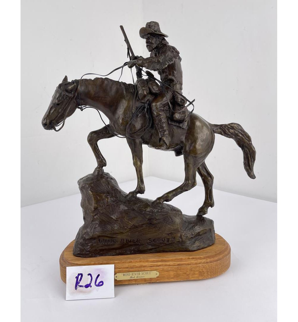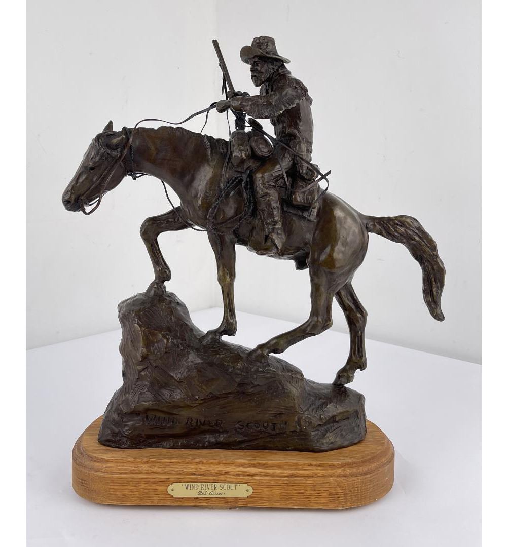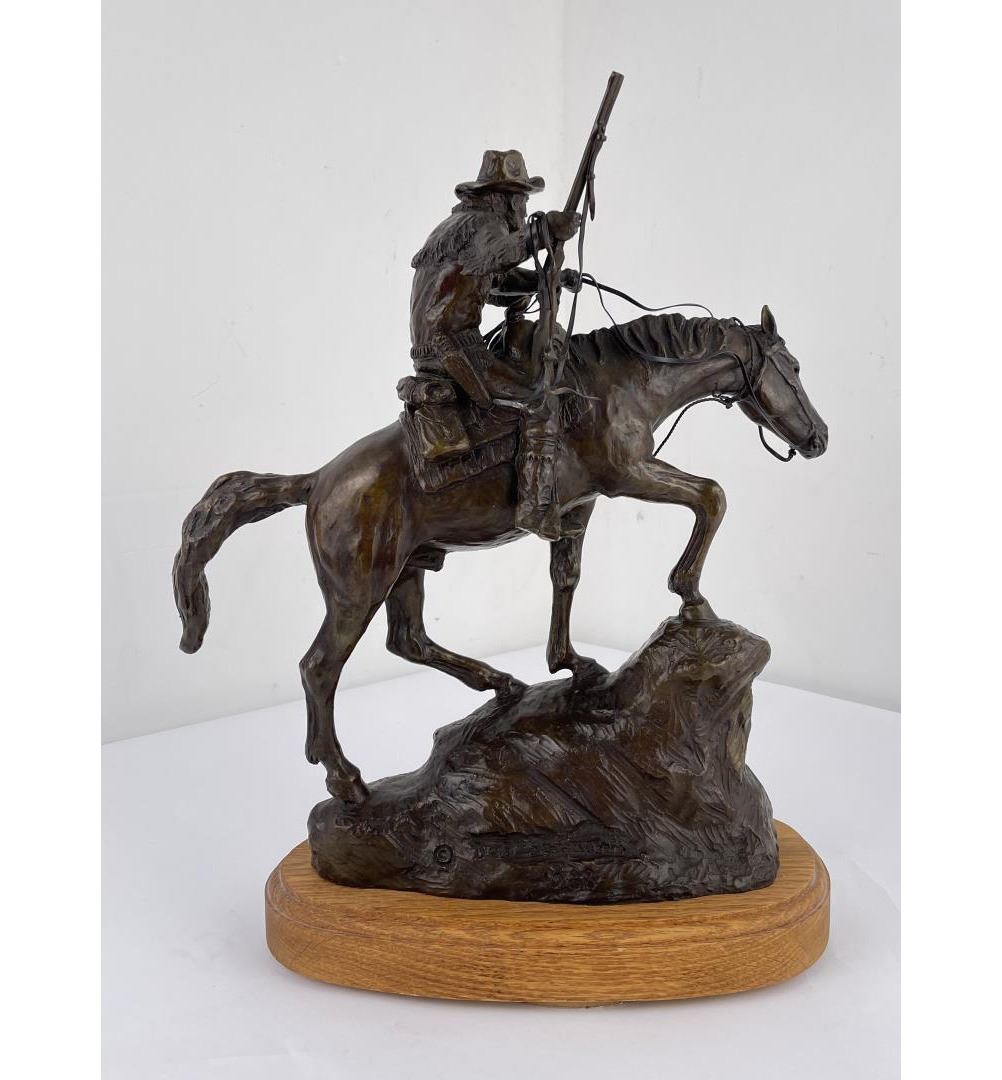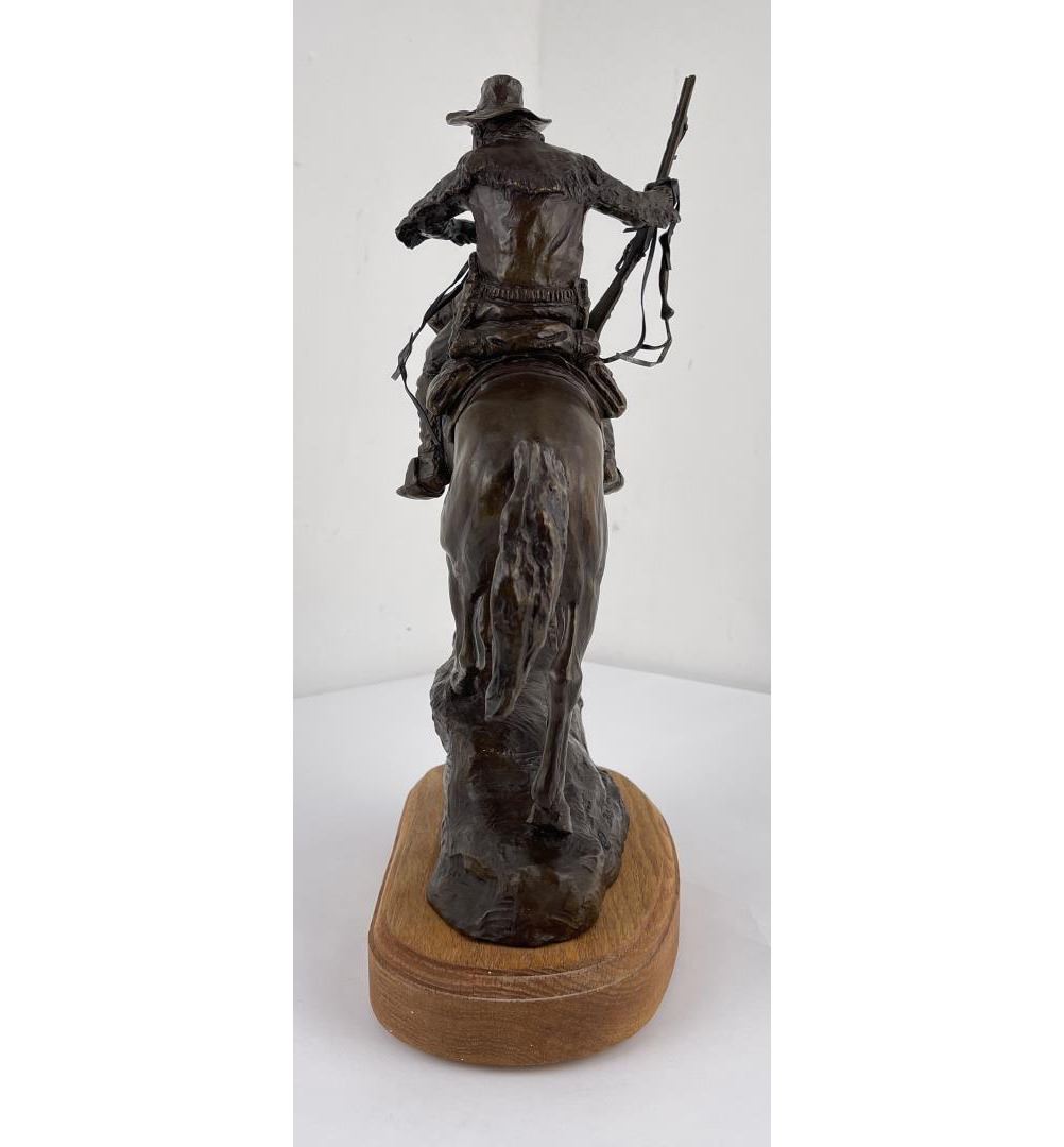 Approximately 18" tall. Bob (Robert Macfie) Scriver (1914 - 1999) was active/lived in Montana. Bob Scriver is known for Animal and western sculpture. Bob Scriver was an elected member in both the Cowboy Artists of America organization and the National Academy of Western Art. He was a member of the Salmagundi Club and was accepted for membership in the National Sculpture Society. Scriver created heroic sculptures in Montana of the expedition of Lewis and Clark, and in Wyoming of the legendary Buffalo Bill. His Cowboy works include a heroic work of Bill Linderman at the Cowboy Hall of Fame in Oklahoma and his "Rodeo In Bronze" series, one of four belonging to the Devonian Institute in Canada. Scriver was commissioned to do such pieces as a Montana Trapper and belt buckle for the Montana Historical Society to help raise funds to purchase the C.M. Russell painting, When the Land Belonged to God, which raised $96,000.00. In 1981, for the Winchester Arms Company, he was also commissioned to do a famous logo called, The Winchester Rider. This set a new record for contemporary sculptors with gross sales totaling over one million dollars. This edition of 250 was completely sold out in 30 days from the time of National advertising. Scriver's art depicts a sense of freedom that has been lost by the Indian and is seemingly being lost by the cowboy. The Late Dr. Harold McCracken, Director Emeritus of the Whitney Gallery of Western Art, was quoted in the forward of Scriver's book NO MORE BUFFALO as calling Scriver: "America's foremost sculptor today-bar none". Scriver died January 29,1999. He has left behind him stories, and dreams of the West....in bronze.