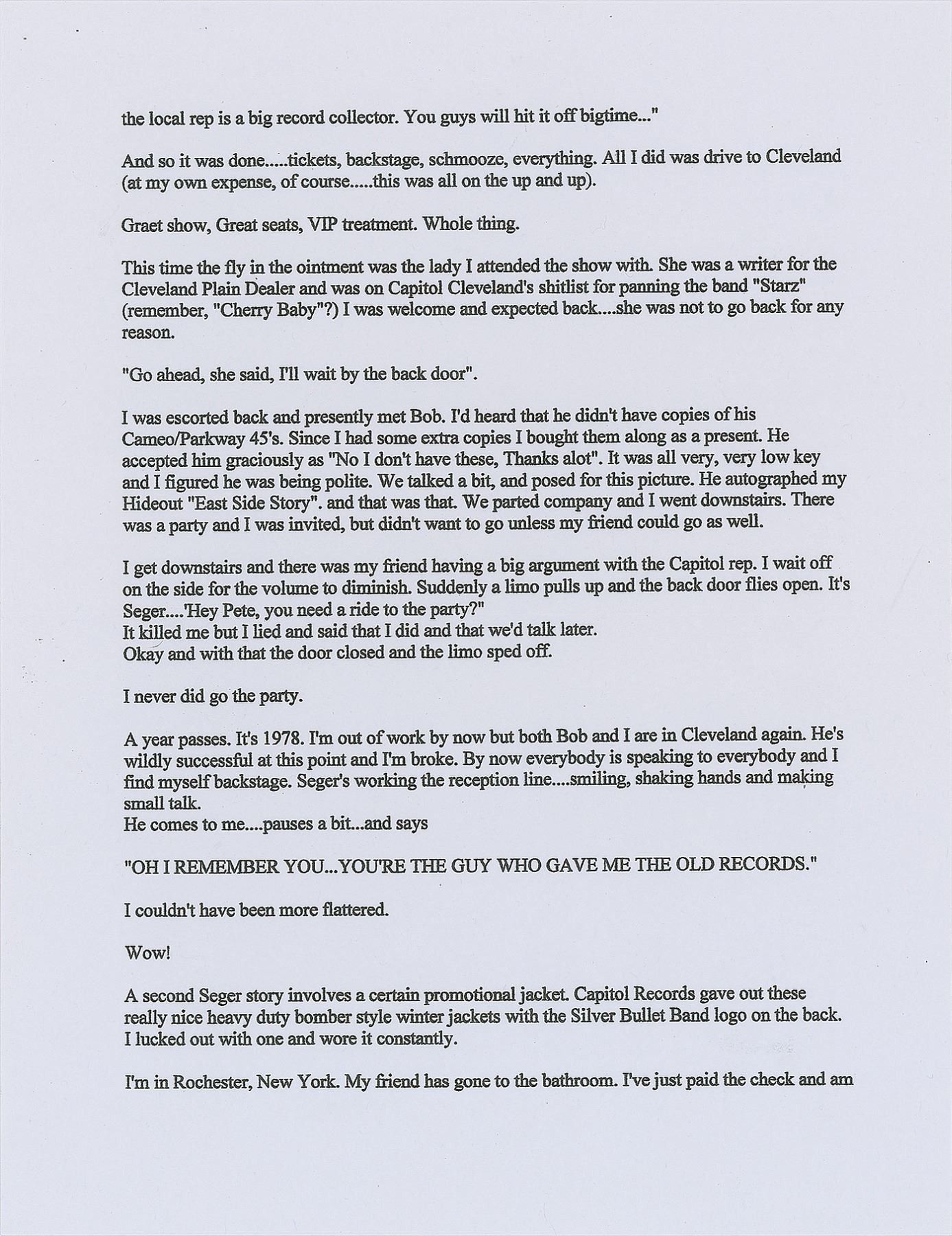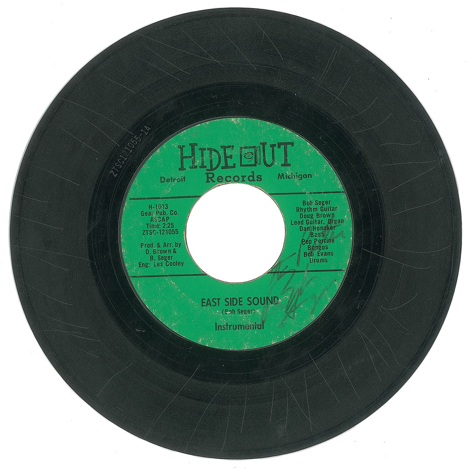 This is an excessively rare copy of Seger's first commercial record "East Side Story" on Hideout Records. "East Side Story" was recorded for a local label owned by a friend of Seger in January 1966. They only had enough money to pay for one song, thus the "B" side, "East Side Sound" is the instrumental track without vocals. It was enough of a hit in Seger's hometown of Detroit to later be released on Cameo Parkway records and made the charts in a few small cities around the country. The Cameo single is scarce, but the Hideout release is much more unusual and rarely seen. This, the original mix of these songs, has never been officially re-released.