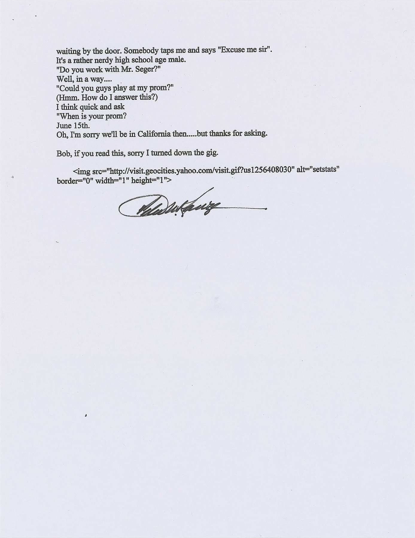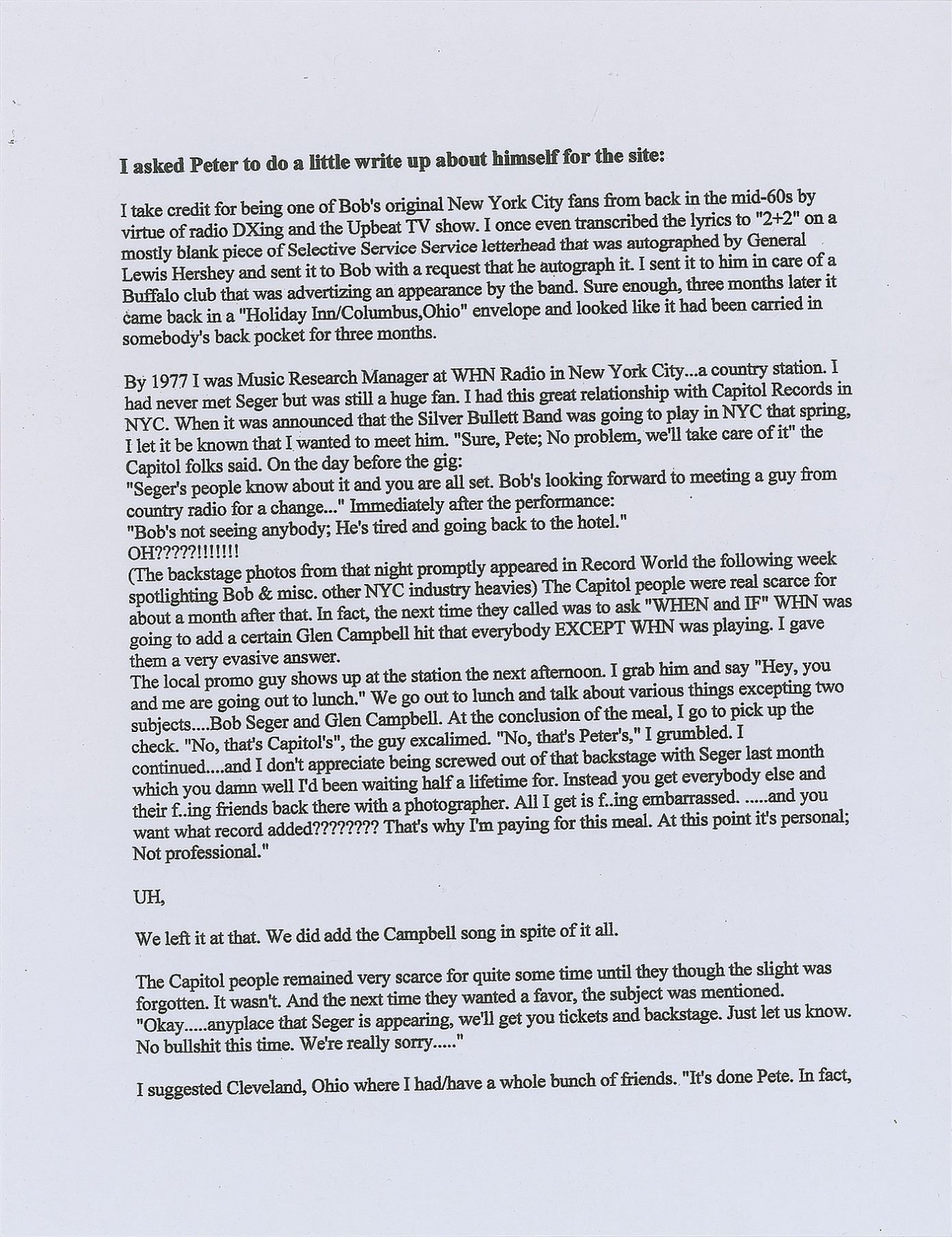 Hideout Records 45 RPM single record for 'East Side Story / East Side Sound,' signed and inscribed on the B side label in black felt tip, "To Peter, Bob Seger." In very good condition, with scratches to the vinyl and light scuffing to the label. Accompanied by a lengthy letter of provenance and an image of Seger posing with the original recipient, Grammy Award nominee Peter Kanze, author and radio/TV historian producer.