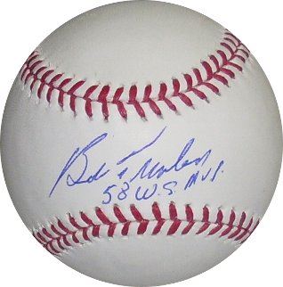 Bob Turley played for the Yankees from 1955 to 1962. His best year was 1958, when he won 21 games and lost seven. As a result, he won the Hickok Belt as top professional athlete of the year, and the Cy Young Award as the best pitcher in Major League Baseball. Bob Turley has hand autographed Official Major League Baseball with 58 WS MVP. Private Signing in White Plains, NY, on August 19, 2011. Certificate of Authenticity from Athlon Sports.
