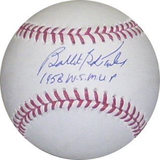 Bob Turley played for the Yankees from 1955 to 1962. His best year was 1958, when he won 21 games and lost seven. As a result, he won the Hickok Belt as top professional athlete of the year, and the Cy Young Award as the best pitcher in Major League Baseball. Bob Turley has hand autographed this Official Major League Baseball with Bullet and 1958 WS MVP inscriptions. James Spence Hologram and Certificate of Authenticity.
