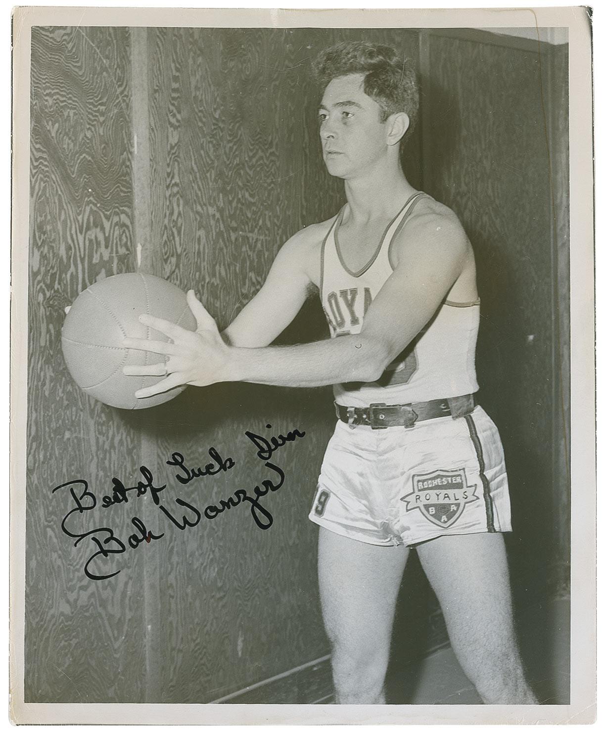 Basketball Hall of Famer. Glossy 8 x 10 photo of Wanzer in his Rochester Royals uniform, signed and inscribed in black felt tip “Best of luck Jim, Bob Wanzer.” In good condition, with moderate creasing and wrinkles, scattered surface marks, some areas of rippling, and some crazing to finish.