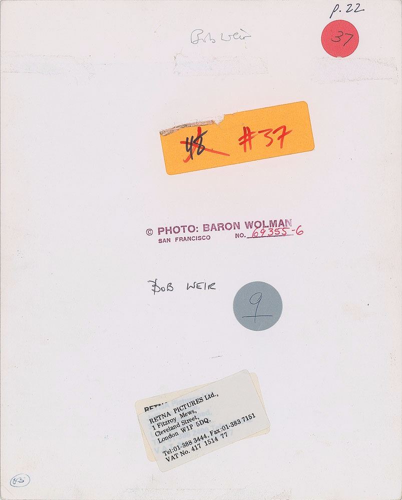 Original matte-finish 8 x 10 silver gelatin photo of Grateful Dead guitarist Bob Weir in a contemplative half-length pose. Reverse bears a Baron Wolman copyright stamp and two affixed RETNA Pictures labels. In fine condition, with some surface loss and creasing to borders (easily matted out), and some faint surface marks to image. Wolman is a famed rock photographer best known for his work with Rolling Stone during the magazine's nascent years. From the Globe Photo archives.
