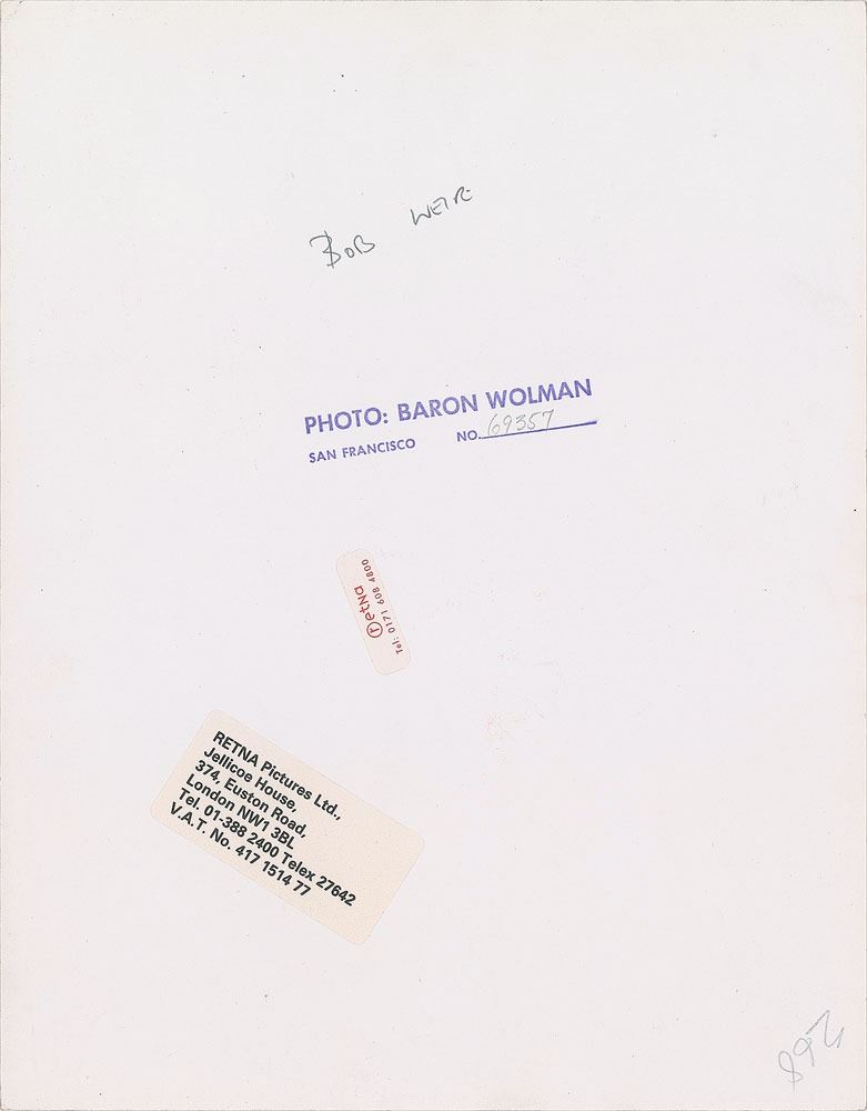 Original vintage glossy 8.5 x 11 contact sheet print featuring twelve images of Grateful Dead singer-songwriter and guitarist Bob Weir. One portrait is marked with grease pencil. Reverse bears a Baron Wolman credit stamp and RETNA Pictures label. In fine condition, with light edgewear and creasing to corners. Wolman is a famed rock photographer best known for his work with Rolling Stone during the magazine's nascent years. From the Globe Photo archives.
