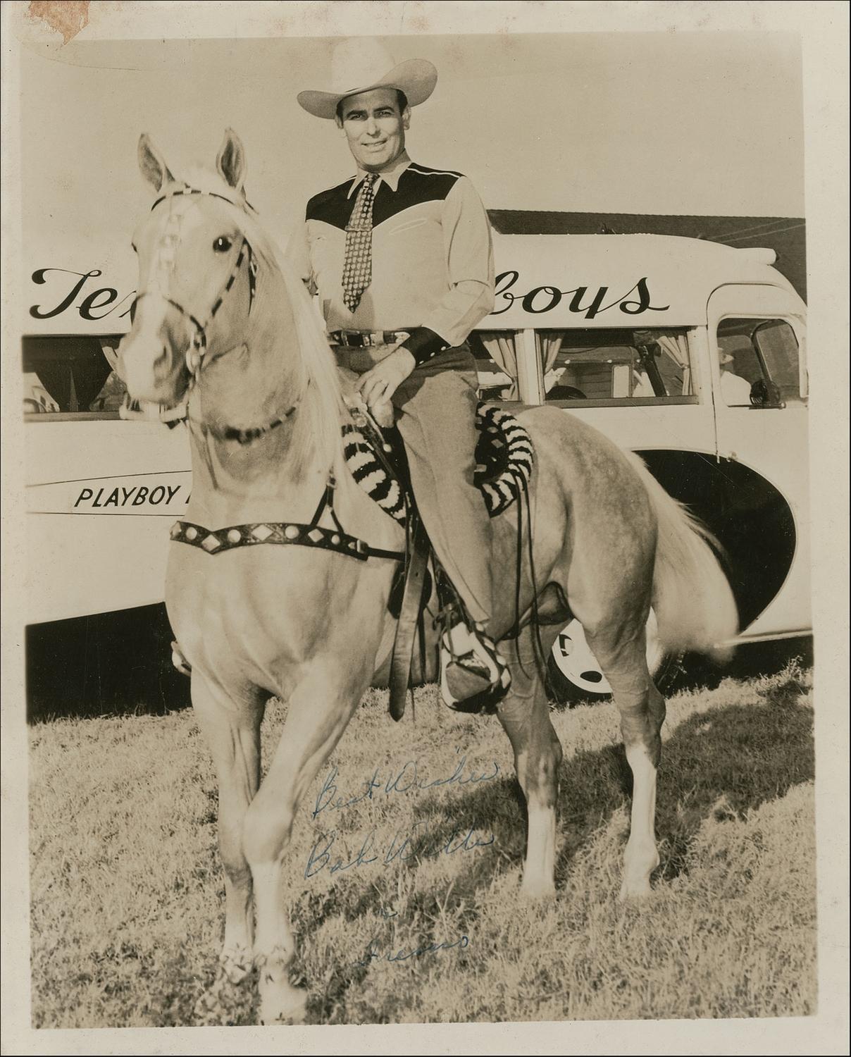 Vintage glossy 8 x 10 photo of Wills atop his horse, signed in blue ink, “Best wishes, Bob Wills & Fresno.” In very good condition, with scattered creasing and soiling, some foxing to top border, and some light contrast to signature.