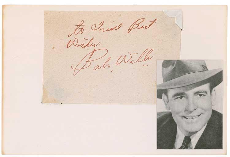 American musician and songwriter (1905–1975) credited with inventing Western swing, a lively hybrid of musical influences that added drums and a brass section to traditional country music instrumentation. Vintage ink signature and inscription, “To Irine, Best wishes, Bob Wills,” on a 3.75 x 2.5 slip. Slip is affixed to a 6 x 4 off-white card via a clipped photo affixed to lower right. In fine condition, with a mild overall shade of toning. RRAuction COA.