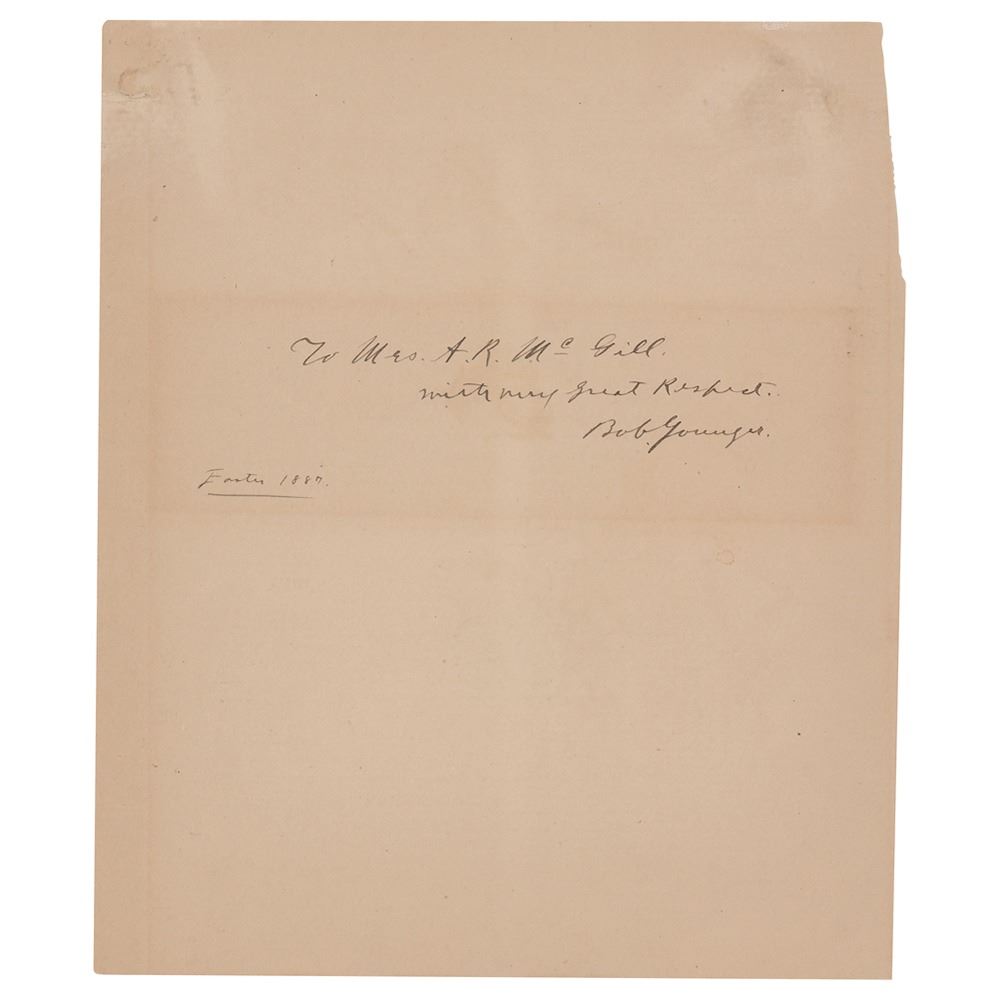 Rare fountain pen signature and inscription, "To Mrs. A. R. McGill, with my great respect, Bob Younger, Easter 1887,‰Û on an off-white 7.5 x 9 sheet. In fine condition, with light toning from prior display.