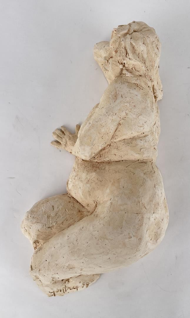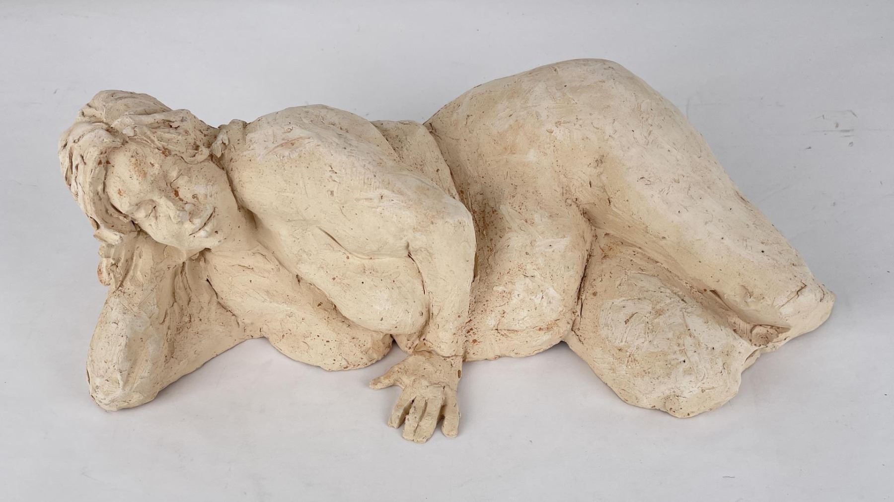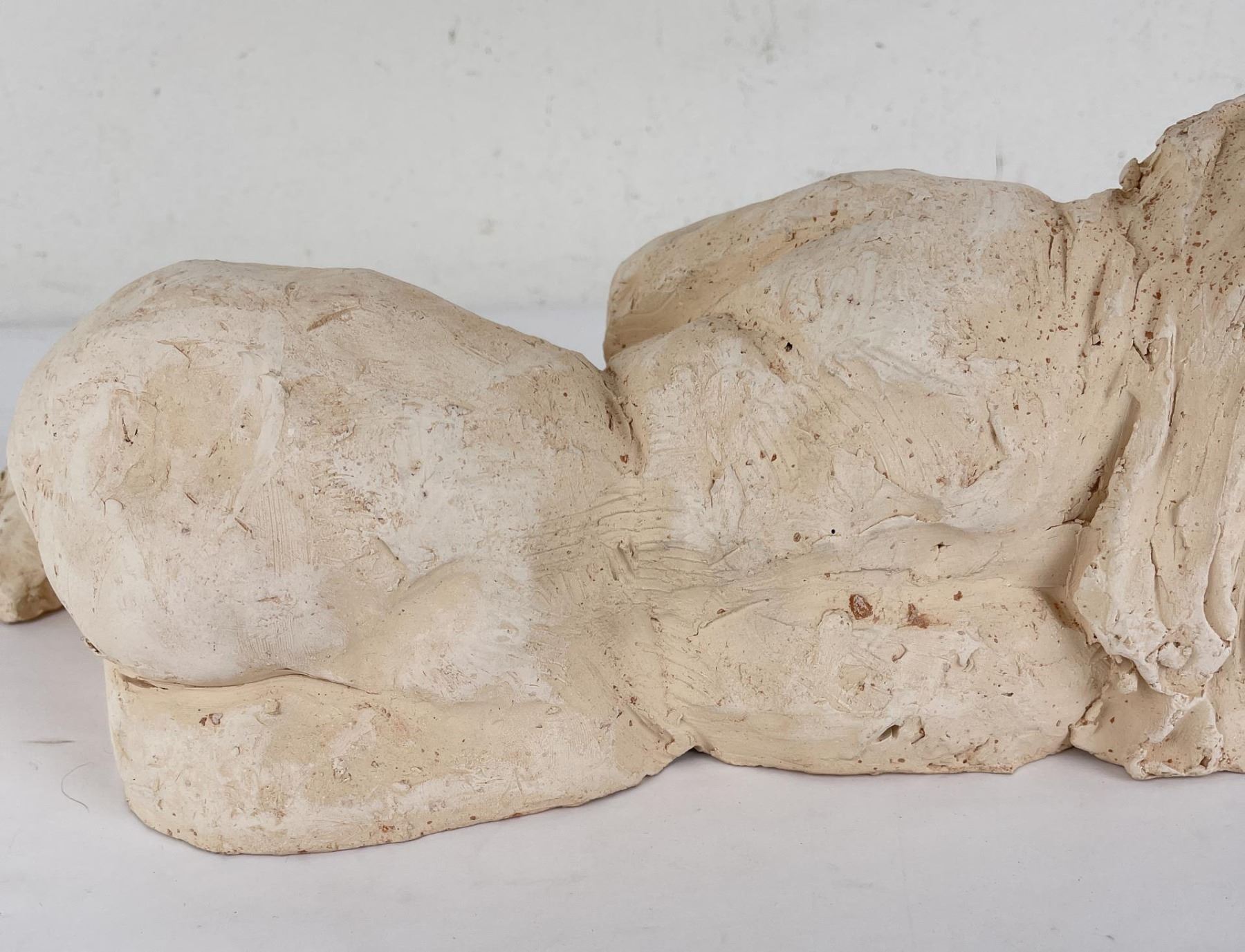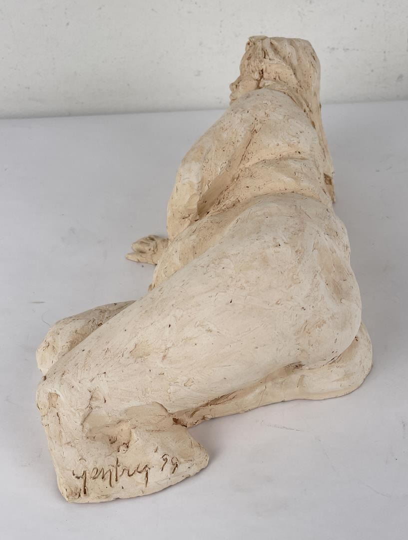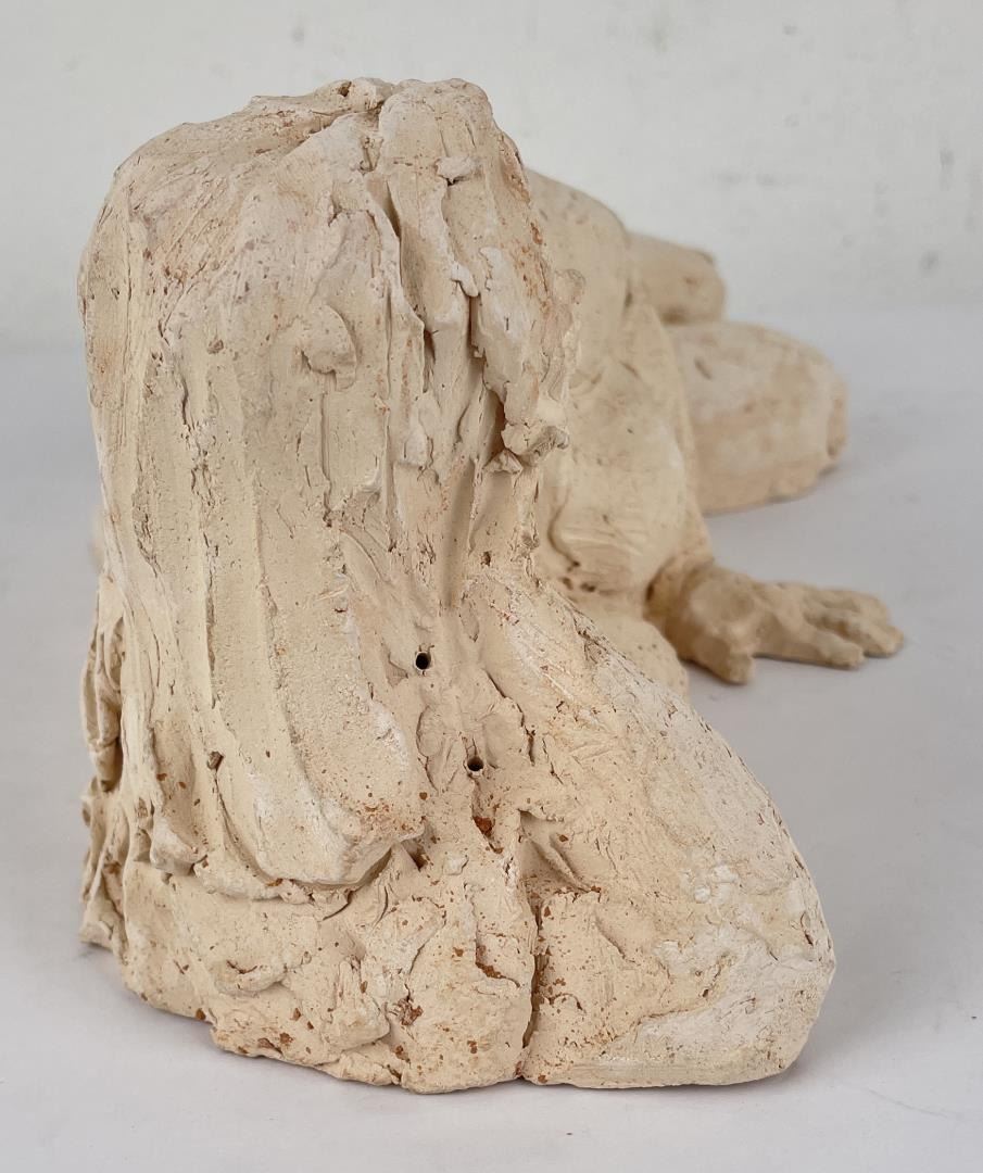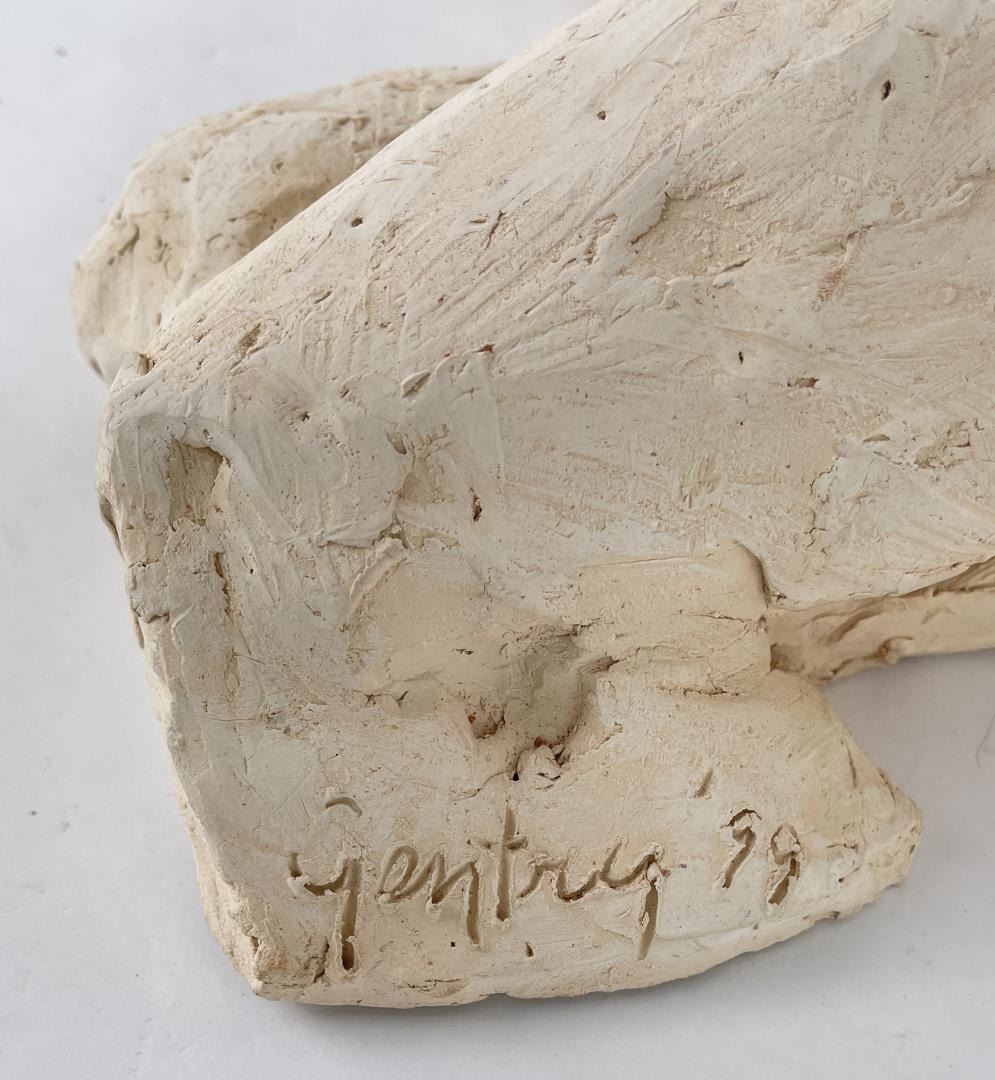 Hand has been broken and repaired as shown. 15" long, 6" tall, 8" wide. Bobbe Gentry (20th century) was active/lived in Texas. Bobbe Gentry is known for Sculptor-classical figure. Originally a painter and later a ceramist, she combined the two art forms to create richly colored, textured three-dimensional figures with flowing composition. Gentry is a resident of Poetry, Texas and was educated at Sam Houston State University in Texas, Newport College of William and Mary, the University of Connecticut, and Southern Methodist University in Texas. She has been a student of Grant Speed, Stanley Bleifeld, Garland Weeks, and Fritz White. She served as Secretary of the Texas Sculpture Association, and was Vice-President of the Creative Arts Center of Dallas.