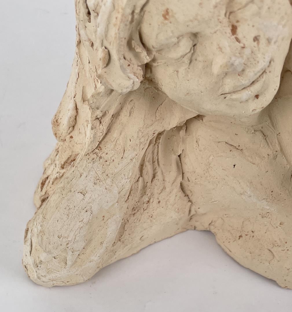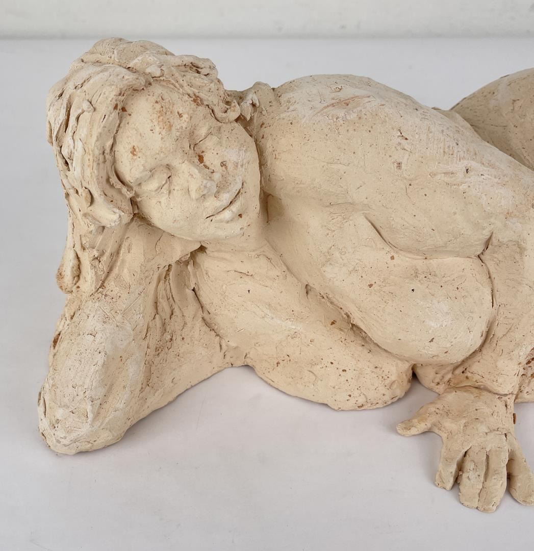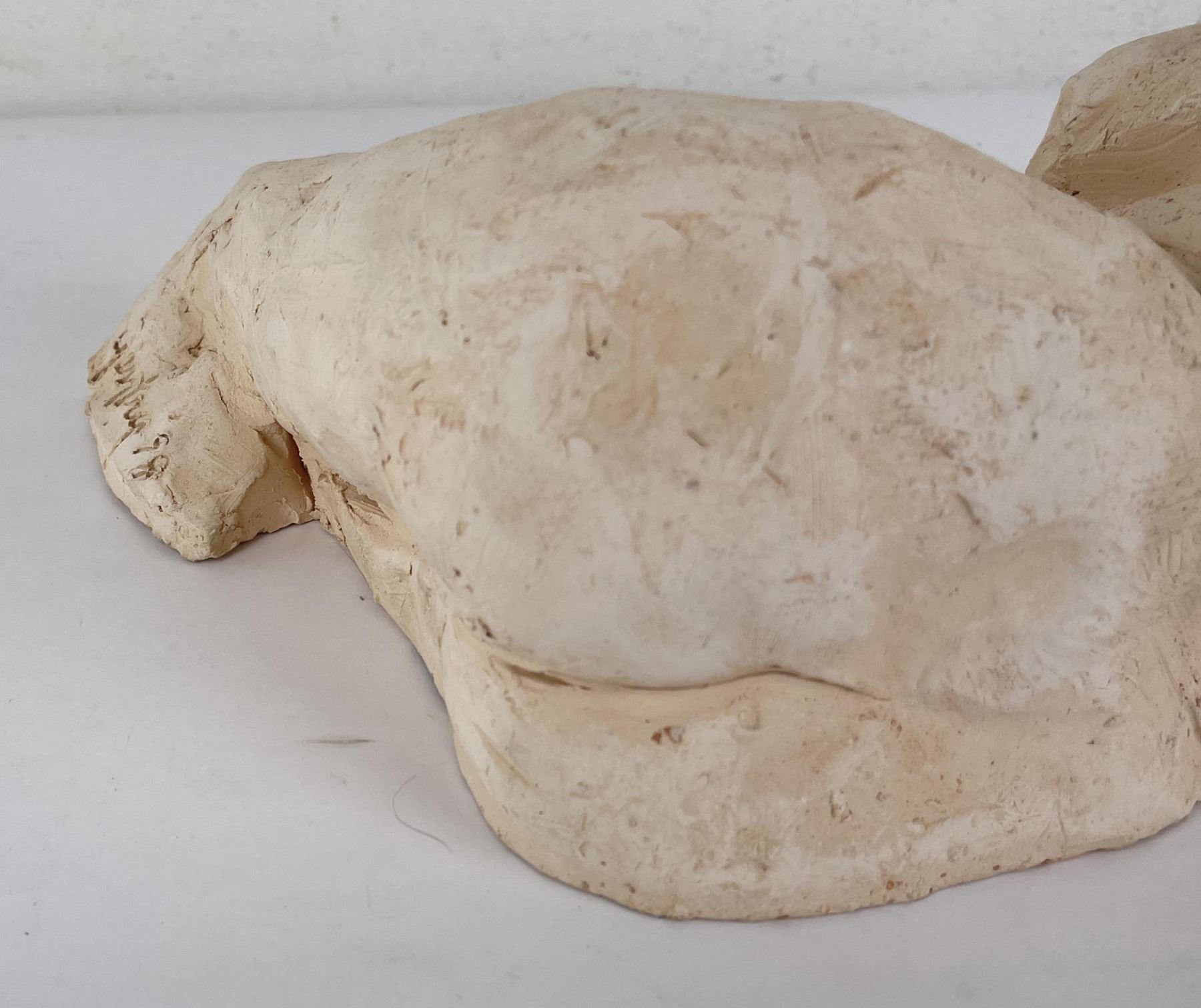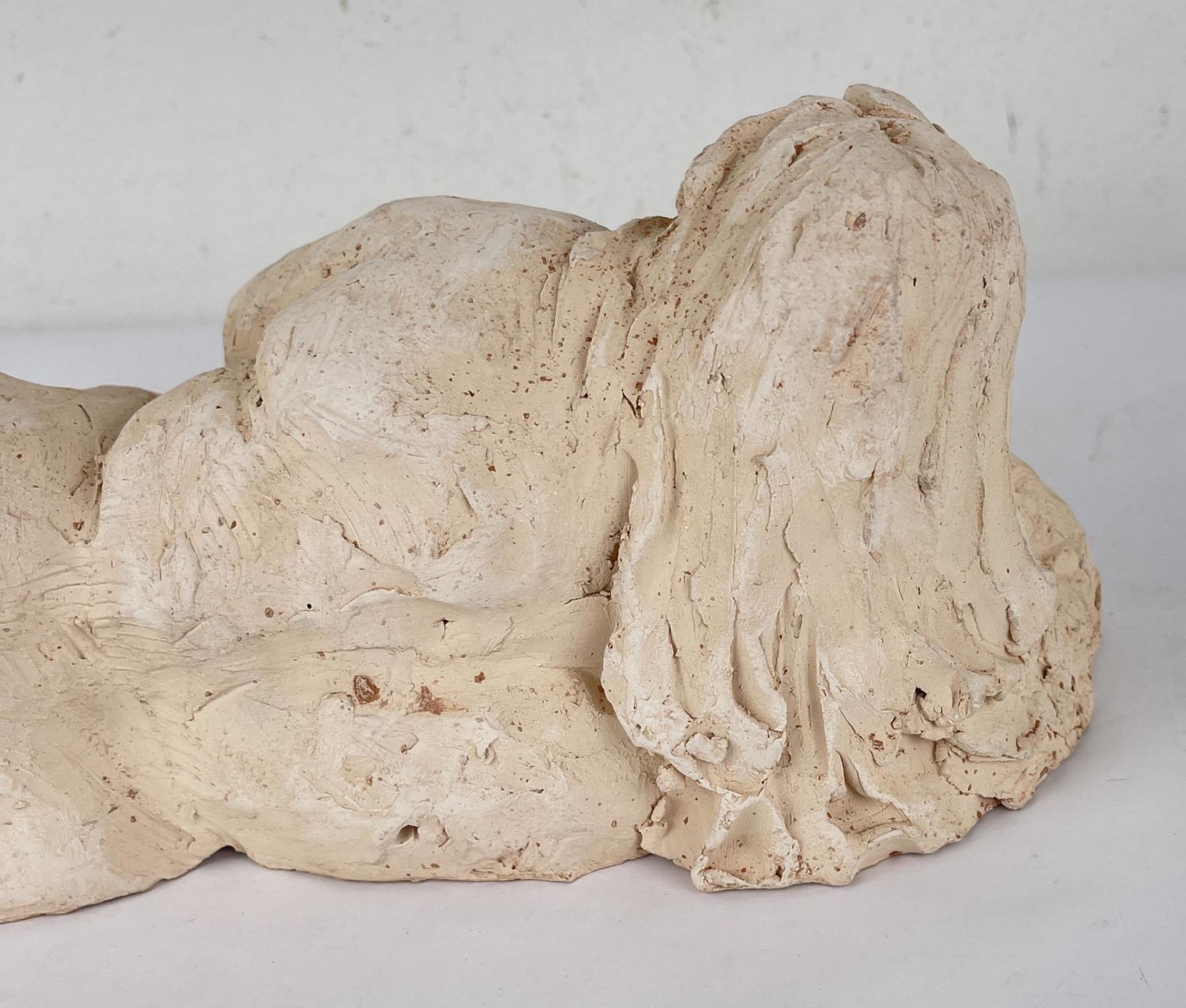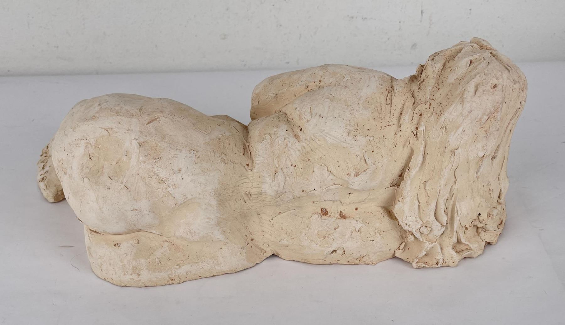Hand has been broken and repaired as shown. 15" long, 6" tall, 8" wide. Bobbe Gentry (20th century) was active/lived in Texas. Bobbe Gentry is known for Sculptor-classical figure. Originally a painter and later a ceramist, she combined the two art forms to create richly colored, textured three-dimensional figures with flowing composition. Gentry is a resident of Poetry, Texas and was educated at Sam Houston State University in Texas, Newport College of William and Mary, the University of Connecticut, and Southern Methodist University in Texas. She has been a student of Grant Speed, Stanley Bleifeld, Garland Weeks, and Fritz White. She served as Secretary of the Texas Sculpture Association, and was Vice-President of the Creative Arts Center of Dallas.
