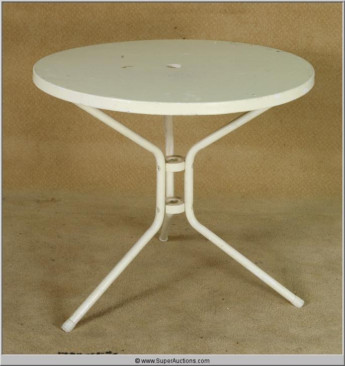 White Metal Patio Table Used as a Movie Prop in the 2006 film "Bobby" starring Emelio Estevez. #2091905 Dimensions: 28"x32"x32"