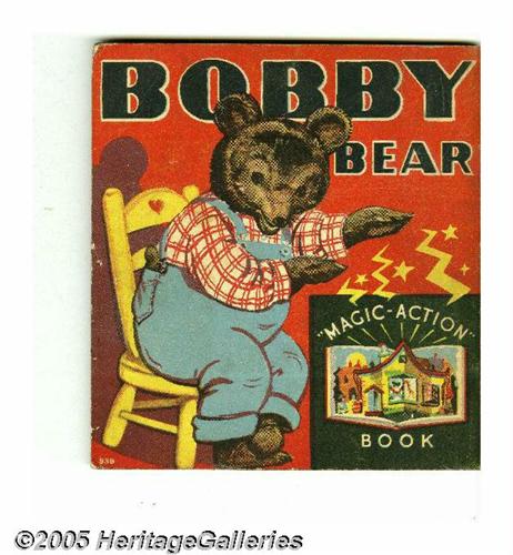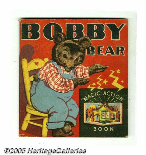 <B>Bobby Bear Magic-Action (Pop-Up) Book (Whitman, 1935) Condition: FN.</B></I> Teddy bear, Bozo, leaves the toy shop for a "real" home, but gets blown away and must find his way back home. The 28 page book measures approximately 7" x 7.75," and is printed in black, green and blue. Three multi-color double-page pop-up scenes are located in the front, middle, and back of the book. Book has very slight warp along right edge, some edge wear and pencil writing on the covers, but remains exceptionally tight and clean. The pop-ups are functional and in Excellent condition. <I>From the Larry Jacobs Collection.</B></I>
