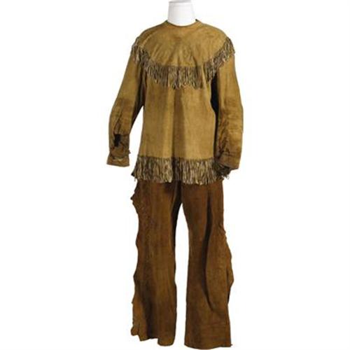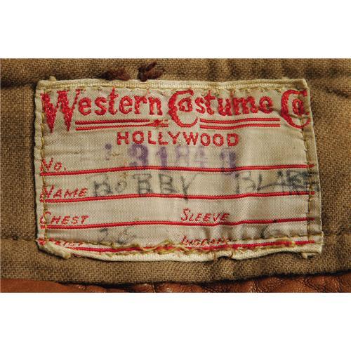 <B>Bobby Blake "Little Beaver" Outfit - Shirt, Pants and Shoes and Photos.</B></I> Decades before Robert Blake fully scored as the dramatic star of <I>In Cold Blood</B></I> and the Emmy-winning star of TV's <I>Baretta,</B></I> he was a child actor best-noted for playing "Little Beaver" in WIld Bill Elliott's <I>Red Ryder</B></I> westerns, produced from 1944 to 1947. Here is Blake's complete "Little Beaver" costume - soft brown leather pants, shirt and shoes. There's a Western Costume Co. tag in the pants with the name "Bobby Blake" printed on it. Also included are three shots of Blake wearing the Little Beaver costume, and one of his old mailing envelopes marked "Bobbie Blake." The costume has some wear to the shoes - otherwise Very Fine condition.<BR><BR><b>Shipping:</b> Clothing, Costumes & Jerseys (<a target="_blank" href="http://www.heritageauctions.com/common/shipping.php">view shipping information</a>)