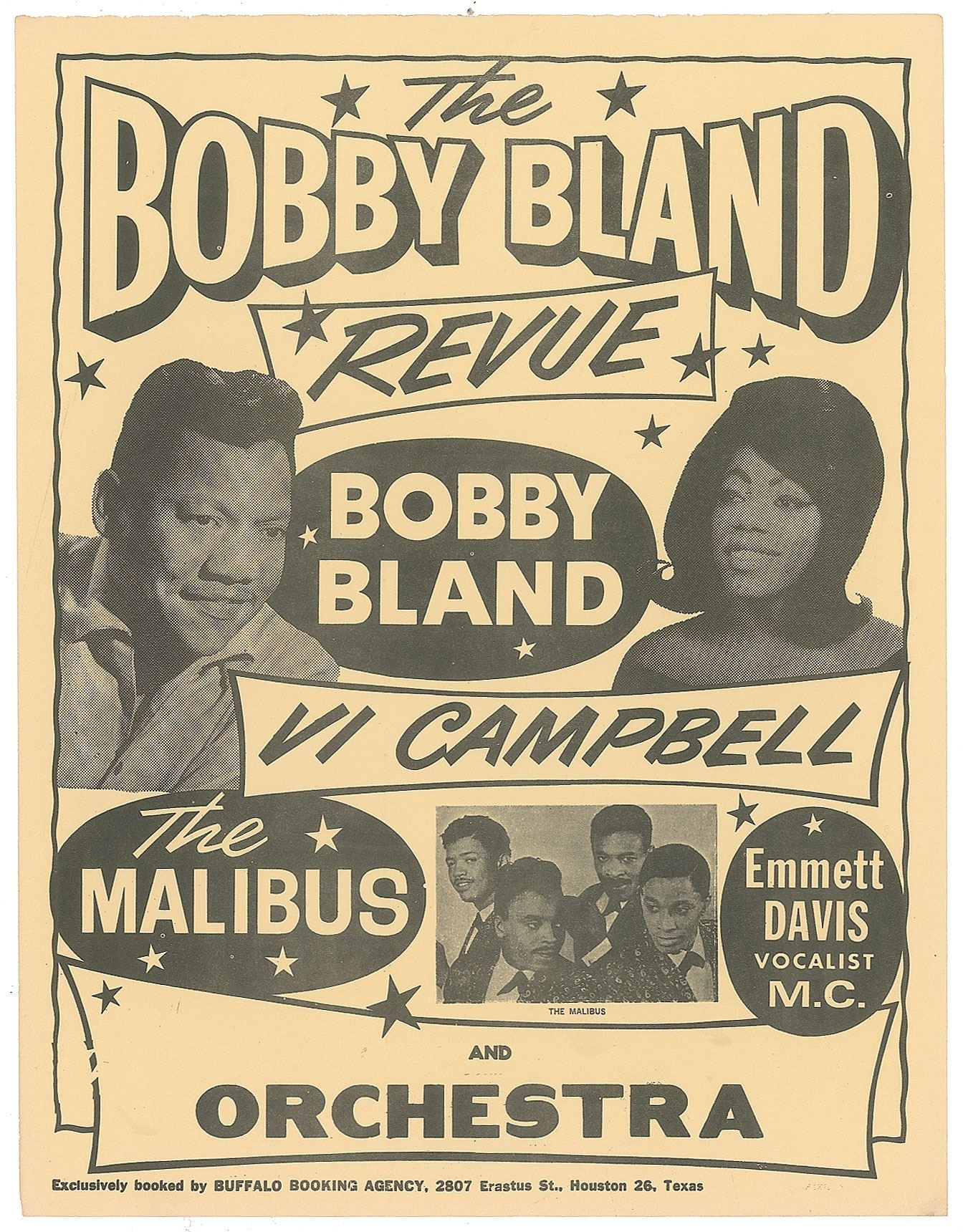 Original early 1960s light yellow 8.5 x 11 handbill for "The Bobby Bland Revue," which features images of Bland, Vi Campbell, and the Malibus, and mentions the support of emcee Emmett Davis and Bland's orchestra. Lower border notes that all concerts to be booked by the Buffalo Booking Agency of Houston, Texas. In fine condition.