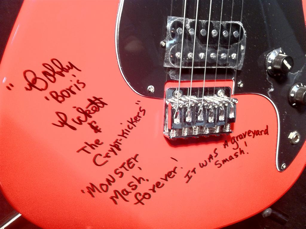Bobby "Boris" Pickett Autographed Guitar - An electric guitar signed by Mr. Pickett who is the writer and performer of the classic hit "Monster Mash", one of the only songs to stay on the charts over three decades. Very rare personalization signed Bobby "Boris" Pickett and the Cryptkeepers. "Monster Mash forever, it was a graveyard smash". Oversized item. Additional shipping charges required.