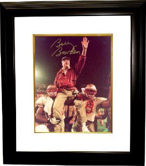 Bobby Bowden coached the Florida State Seminoles football team from the 1976 to 2009 seasons. During his time at Florida State, Bowden led FSU to an Associated Press and Coaches Poll National Title in 1993 and a BCS National Championship National Title in 1999, as well as twelve Atlantic Coast Conference championships since FSU joined the conference in 1991. His final coaching appearance was the 2010 Gator Bowl game on January 1 with a 33-21 victory over his former program, West Virginia. Bobby has hand signed this Florida State Seminoles 8x10 Photo. Certificate of Authenticity from Athlon Sports. Custom White Mat and Premium Black Frame as shown.