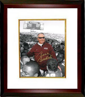 Bobby Bowden coached the Florida State Seminoles football team from the 1976 to 2009 seasons. During his time at Florida State, Bowden led FSU to an Associated Press and Coaches Poll National Title in 1993 and a BCS National Championship National Title in 1999, as well as twelve Atlantic Coast Conference championships since FSU joined the conference in 1991. His final coaching appearance was the 2010 Gator Bowl game on January 1 with a 33-21 victory over his former program, West Virginia. Bobby has hand signed this Florida State Seminoles 8x10 Photo Final Game Carryoff Spotlight. Certificate of Authenticity from Athlon Sports. Custom White Mat and Premium Mahogany Frame as shown.