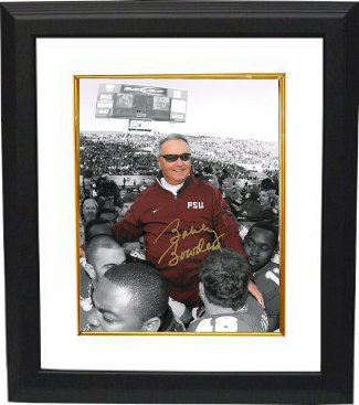 Bobby Bowden coached the Florida State Seminoles football team from the 1976 to 2009 seasons. During his time at Florida State, Bowden led FSU to an Associated Press and Coaches Poll National Title in 1993 and a BCS National Championship National Title in 1999, as well as twelve Atlantic Coast Conference championships since FSU joined the conference in 1991. His final coaching appearance was the 2010 Gator Bowl game on January 1 with a 33-21 victory over his former program, West Virginia. Bobby has hand signed this Florida State Seminoles 8x10 Photo Final Game Carryoff Spotlight. Certificate of Authenticity from Athlon Sports. Custom White Mat and Premium Black Frame as shown.