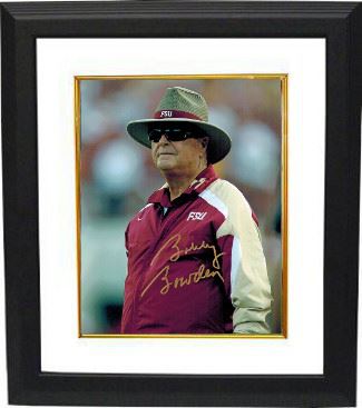 Bobby Bowden coached the Florida State Seminoles football team from the 1976 to 2009 seasons. During his time at Florida State, Bowden led FSU to an Associated Press and Coaches Poll National Title in 1993 and a BCS National Championship National Title in 1999, as well as twelve Atlantic Coast Conference championships since FSU joined the conference in 1991. His final coaching appearance was the 2010 Gator Bowl game on January 1 with a 33-21 victory over his former program, West Virginia. Bobby has hand signed this Florida State Seminoles 8x10 Photo (wearing hat). Schwartz Sports Hologram and Certificate of Authenticity from Athlon Sports. Custom White Mat and Premium Black Color Framed as shown.
