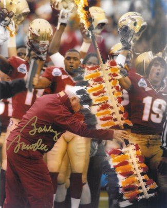 Bobby Bowden coached the Florida State Seminoles football team from the 1976 to 2009 seasons. During his time at Florida State, Bowden led FSU to an Associated Press and Coaches Poll National Title in 1993 and a BCS National Championship National Title in 1999, as well as twelve Atlantic Coast Conference championships since FSU joined the conference in 1991. His final coaching appearance was the 2010 Gator Bowl game on January 1 with a 33-21 victory over his former program, West Virginia. Bobby has hand signed this Florida State Seminoles 8x10 Photo spiking the spear! in his final game. Certificate of Authenticity from Athlon Sports.