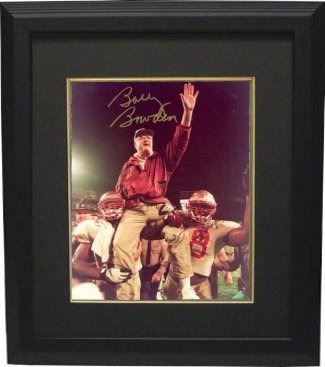 Bobby Bowden coached the Florida State Seminoles football team from the 1976 to 2009 seasons. During his time at Florida State, Bowden led FSU to an Associated Press and Coaches Poll National Title in 1993 and a BCS National Championship National Title in 1999, as well as twelve Atlantic Coast Conference championships since FSU joined the conference in 1991. His final coaching appearance was the 2010 Gator Bowl game on January 1 with a 33-21 victory over his former program, West Virginia. Bobby has hand signed this Florida State Seminoles Carry Off the Field 8x10 Photo. Custom Black Mat and Black Framed. Certificate of Authenticity from Athlon Sports.
