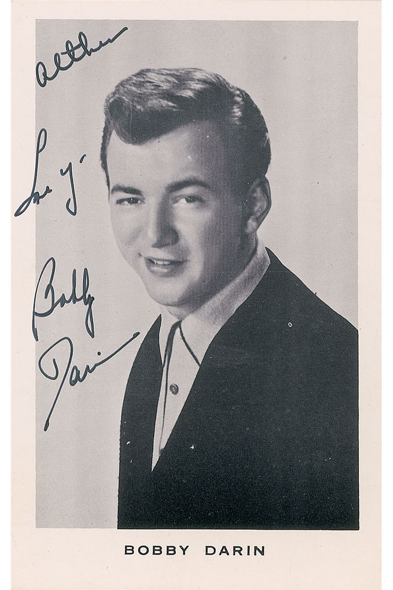 Versatile and popular American performer (1936–1973) who died at the age of 37 from complications following surgery for a faulty heart valve. Cardstock 3.5 x 5.5 photo, signed and inscribed in black felt tip “Althea, Love ya, Bobby Darin.” In fine condition.