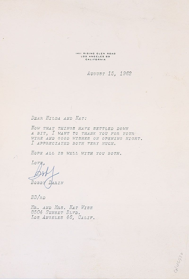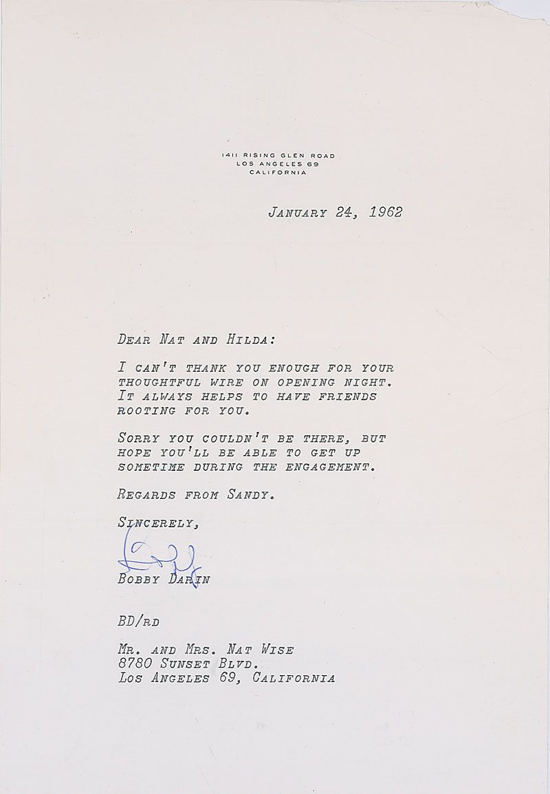 Two TLSs, both signed “Bobby,” one page, 7.25 x 10.5, on his personal letterhead, dated January 24 and August 15, 1962, both to the same recipients, sending thanks for well wishes on opening nights. In fine condition, paper loss to one top right corner, and a diagonal crease to the other letter.