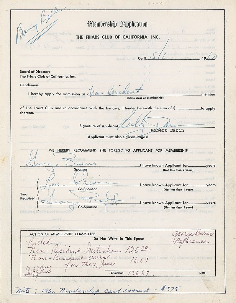 Partly-printed DS, one page both sides, 8.5 x 11, May 6, 1960. Darin’s application for admission to the Friars Club of California as a non-resident member. Signed at the conclusion by Darin as the applicant, also peculiarly signing as his sponsors, “George Burns,” “Lou Irwin,” and “George Raft.” Darin also filled out personal and contact information on the reverse. Mounting strips to reverse edges and expected document wear, otherwise fine condition.